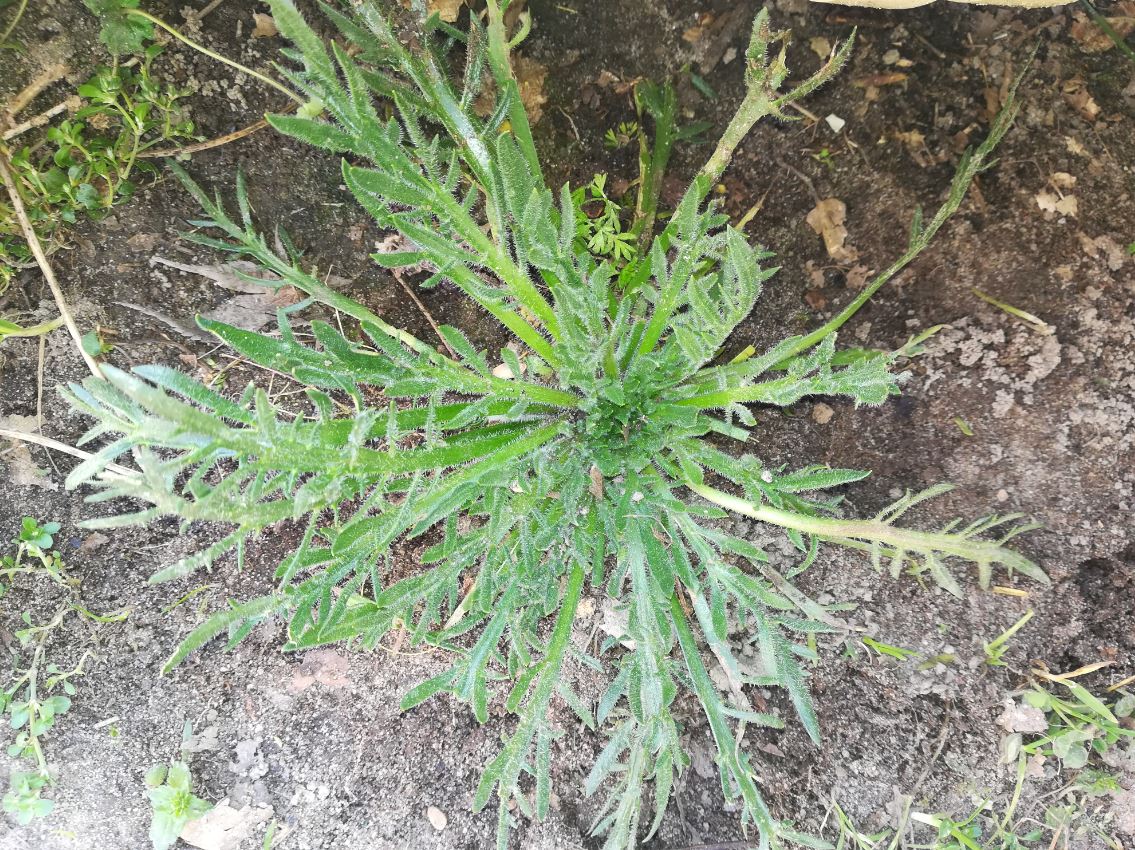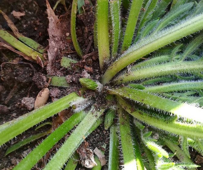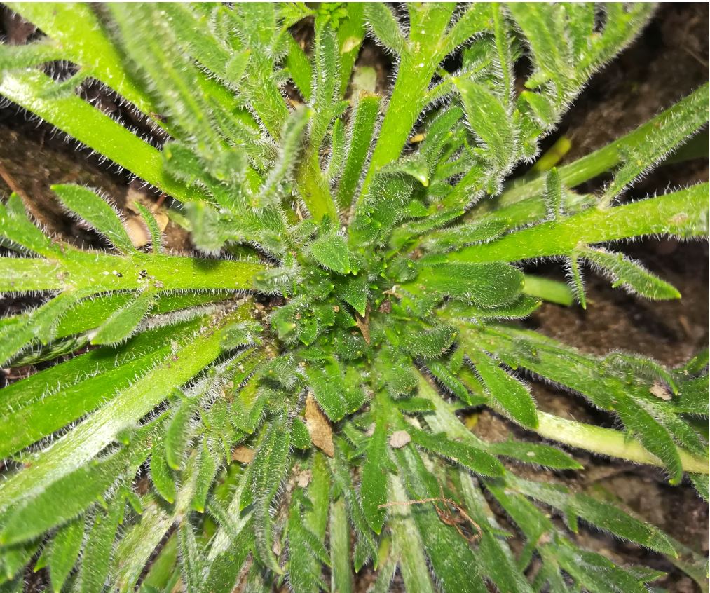 Plante sans tige, rasant le sol, feuilles se structurant en rosace. Feuilles très dentelées, vert foncées et poilues. A la base, on observe l'initiation d'organes différents des feuilles (probablement des fleurs ?) ayant une structure similaire au fleur de pin.