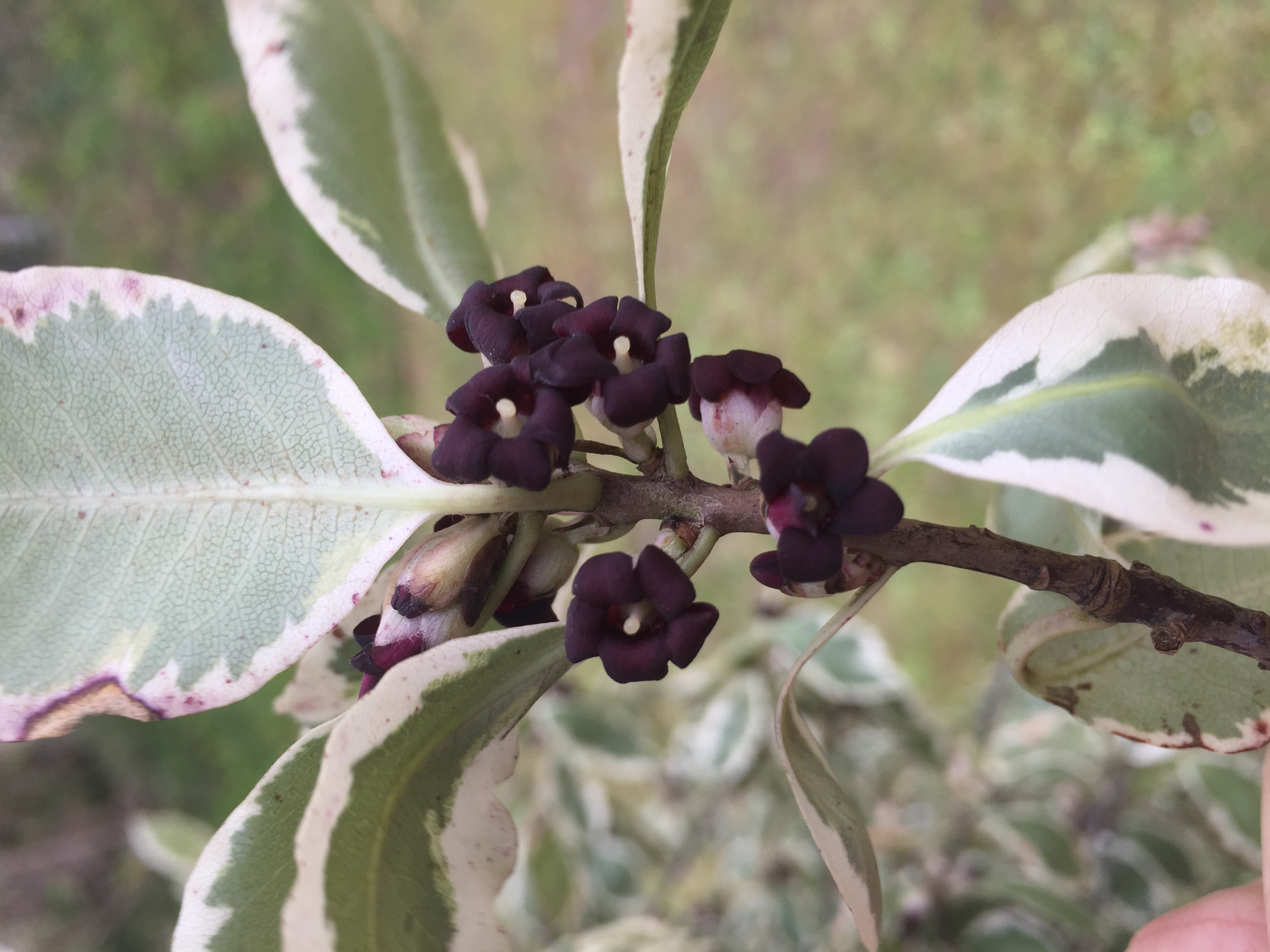 Dans mon jardin, dans le sud du Rhône, il fait office de haie avec le jardin des voisins : arbuste à feuilles épaisses type magnolia, alternes spiralées en termes d'implantation sur la tige. Inflorescence en grappe avec des fleurs alternes spiralées aussi. Petites fleurs blanches.