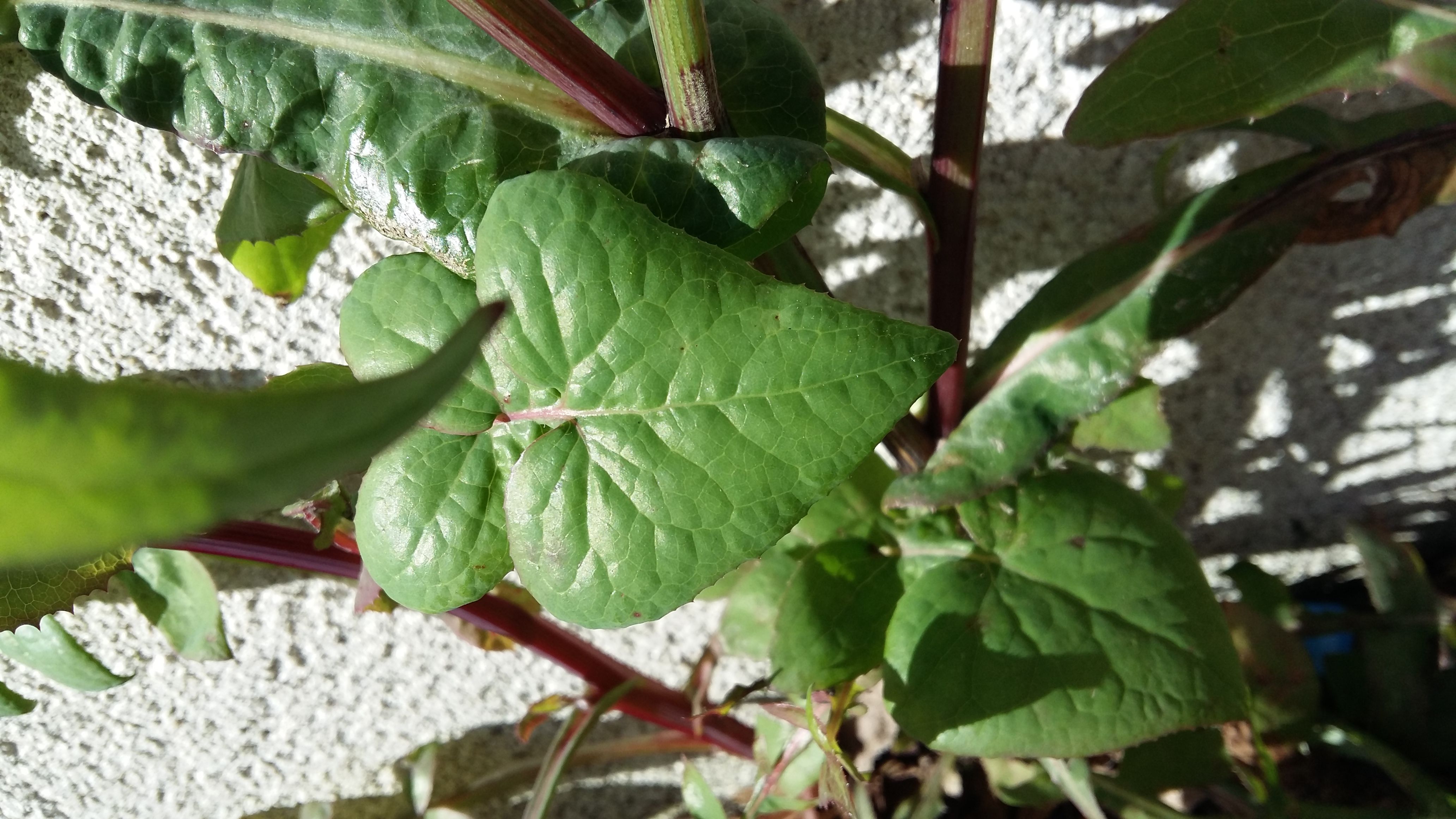 Elle possède des feuilles de forme ovale, avec des nervures très apparentes. De petits poils se situent tout autour et sur la feuille, se qui lui donne au toucher un aspect plutôt rêche. Elle a une odeur particulière et un goût fort qui rappelle l'huître ou le concombre, très amer.