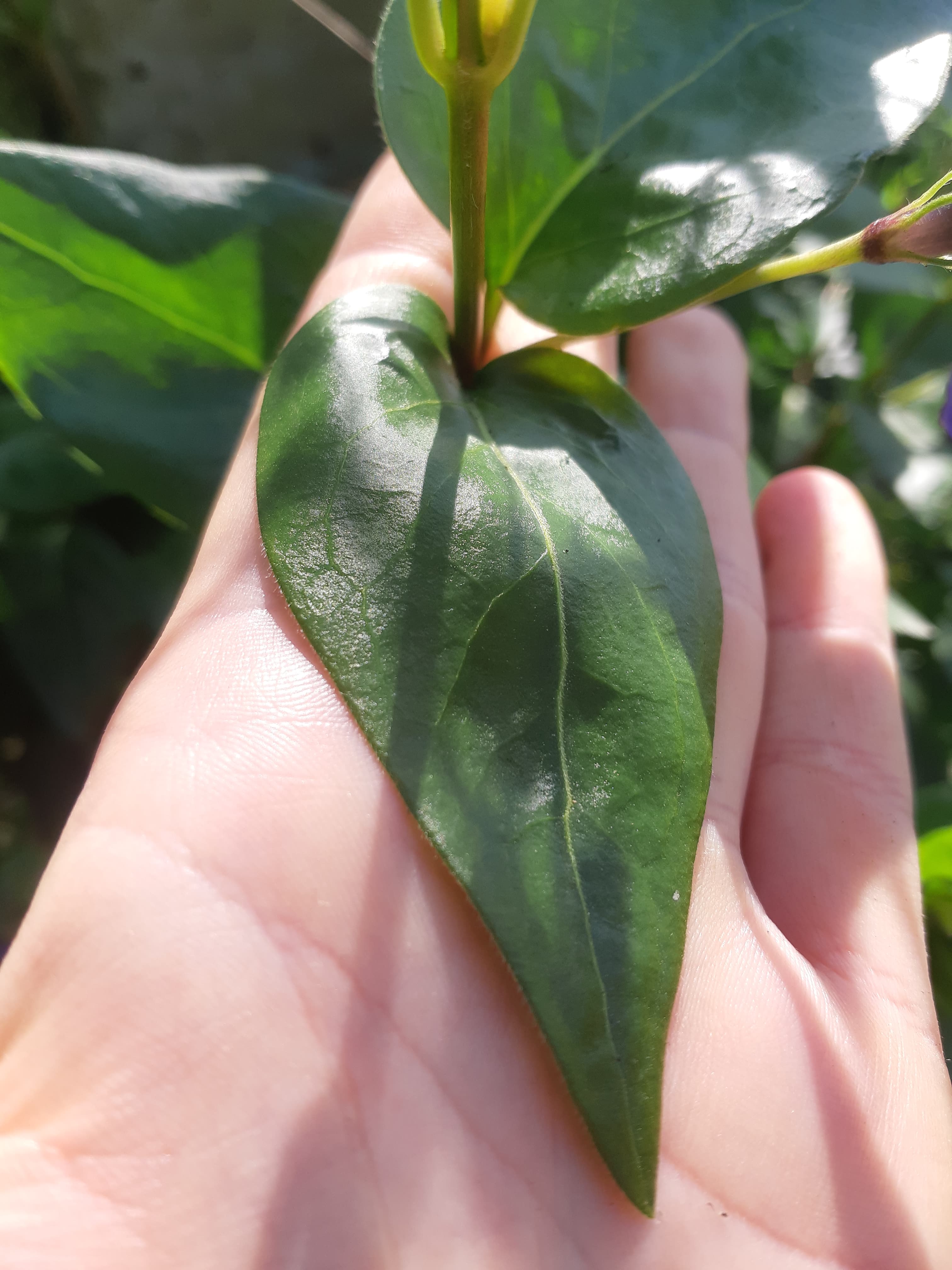 Les fleurs sont violettes à 5 pétales avec une forme carrée au bout, les feuilles sont lisses, leur forme simple et d'un vert profond.