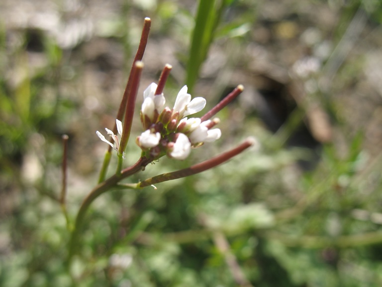 Les caractéristiques qui m'ont marquées: les siliques dressées, les feuilles sont velues et elles sont imposantes par rapport aux toute petites fleurs sont minuscules avec 4 petites pétales blanches en croix.