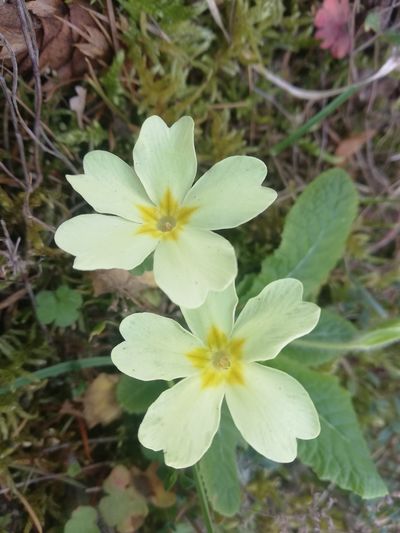 Il s'agit d'une primevère commune (Primula vulgaris) trouvée dans le jardin. Les aspects remarquables de cette plante sont ses fleurs à 5 pétales, de couleur jaune pâle et avec une couronne orangée au centre. Ses feuilles sont disposées en rosette. Cette plante est également assez odorante.