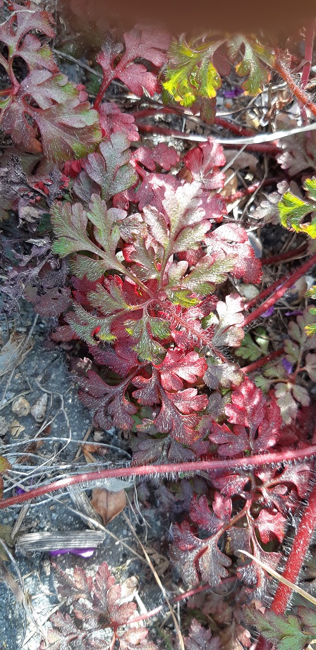 Geranium purpureum est une plante annuelle de la famille des Géraniacées (Geraniaceae) aux feuilles opposées ou en rosette, de forme composée, découpée. Les fleurs sont en panicule ou solitaires, de couleur rose. Elle fleurit d’avril à mai. Elle n' est pascomestible.