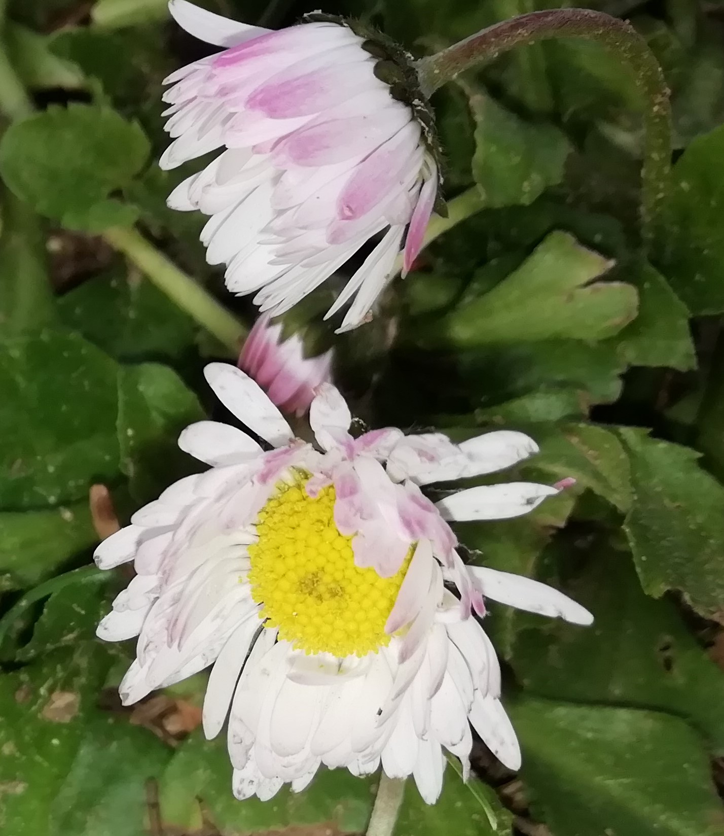 Présente en grand nombre dans mon jardin (Belgique) dans la pelouse. Son nom : Bellis perrenis (je pense) ou pâquerette. Elle fait partie de la famille des Astéracées. Sa feuille est velue.