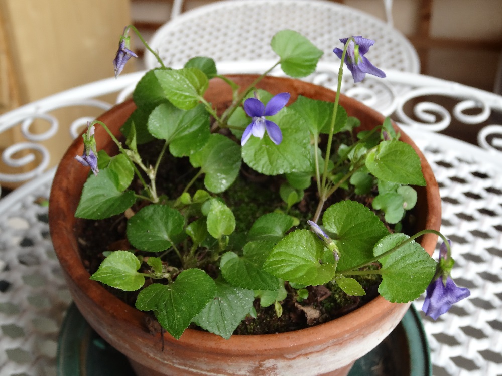 Autre aspect remarquable, certaines violettes sont très odorantes. Celle-ci malheureusement ne sent pas en ce moment. Est-ce que c'est parce que ce type-là en particulier n' a pas d'odeur? ou bien il fait trop froid pour que le parfum se diffuse ? ou bien les fleurs sont trop récentes, ou au contraire trop vieilles ?