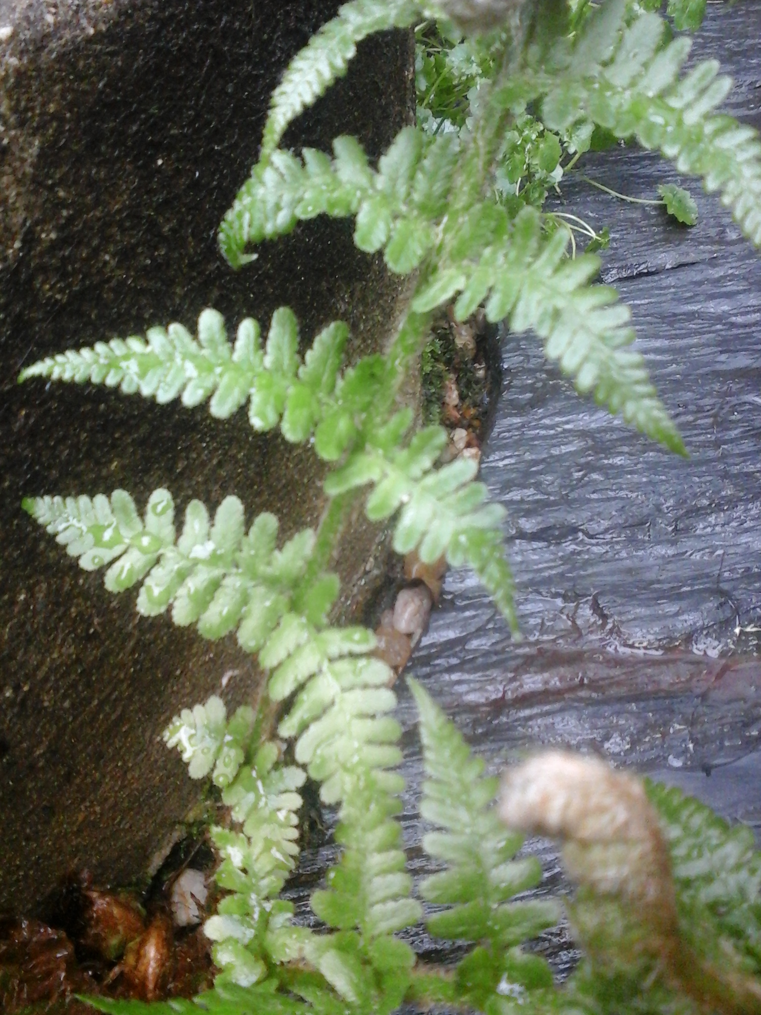 Ci-joint quelques photo (générale, feuilles vue du dessus et feuilles vue du dessus) d'une fougère qui se plait sur le mur de mon jardin (Franche Comté, Haute Saône, exposition ombre). Il m'a semblé identifier une capillaire (asplenium trichomanes?), reconnaissable par la forme ovale et dentelée des feuilles, se petites taille et son pétiole marron.
