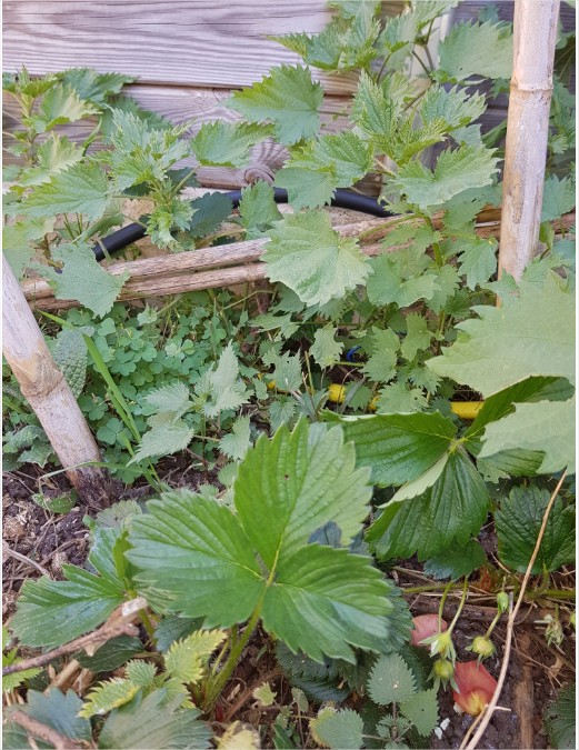Un petit coin de mon jardin de Meuse : Chélidoine, lamier pourpre et de la véronique il me semble, des pousses de framboisier, du chiendent...