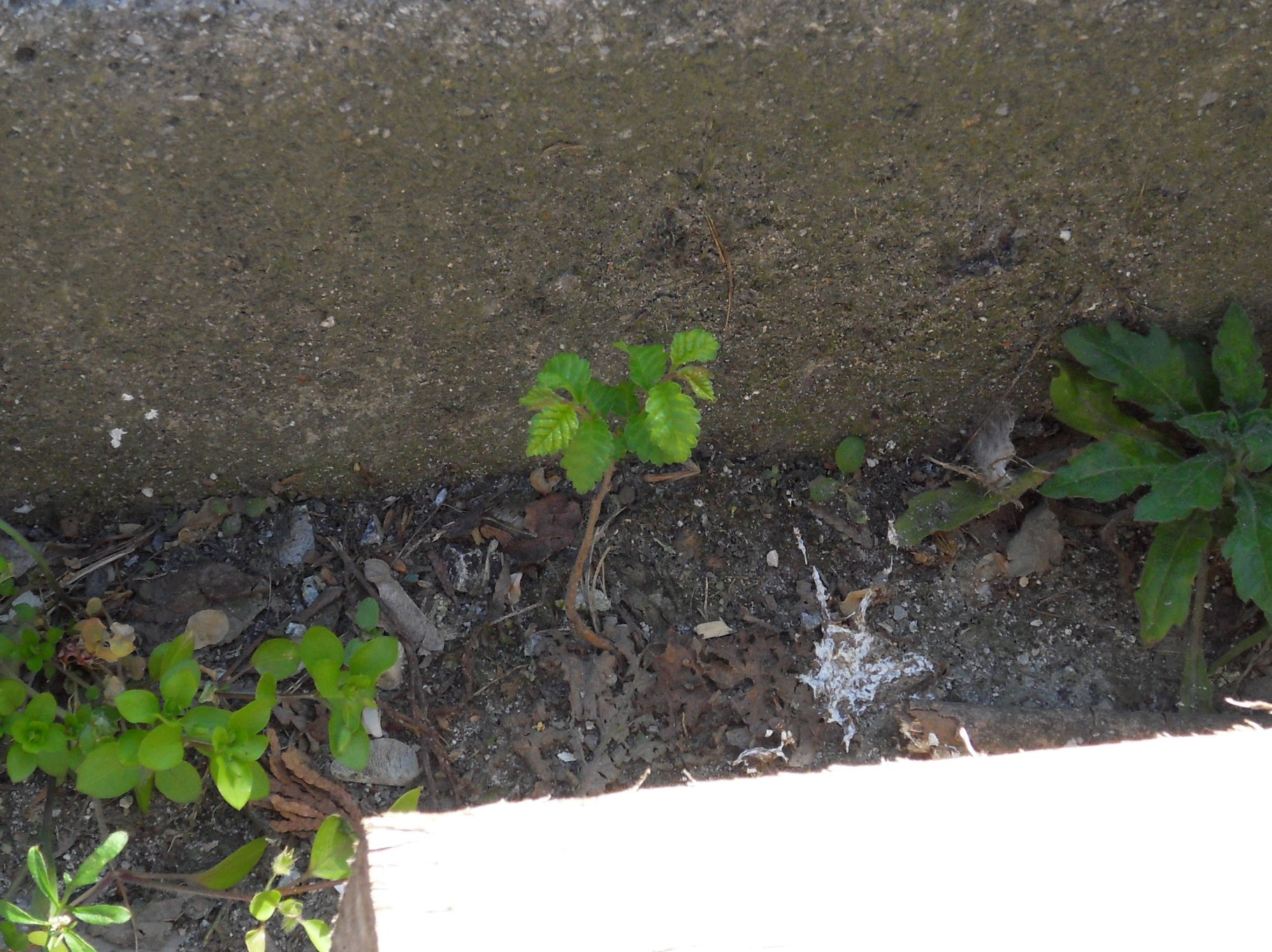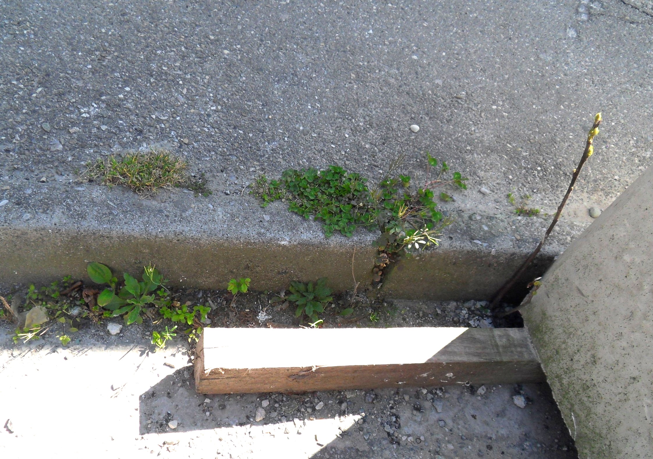 un soupçonde pollution... La photo n'est pas gégé, mais il y a : probablement un début de figuier à droite, de l'oxalis, des graminées inconnues, des astéracées tout aussi inconnues, et même... un petit arbre ?