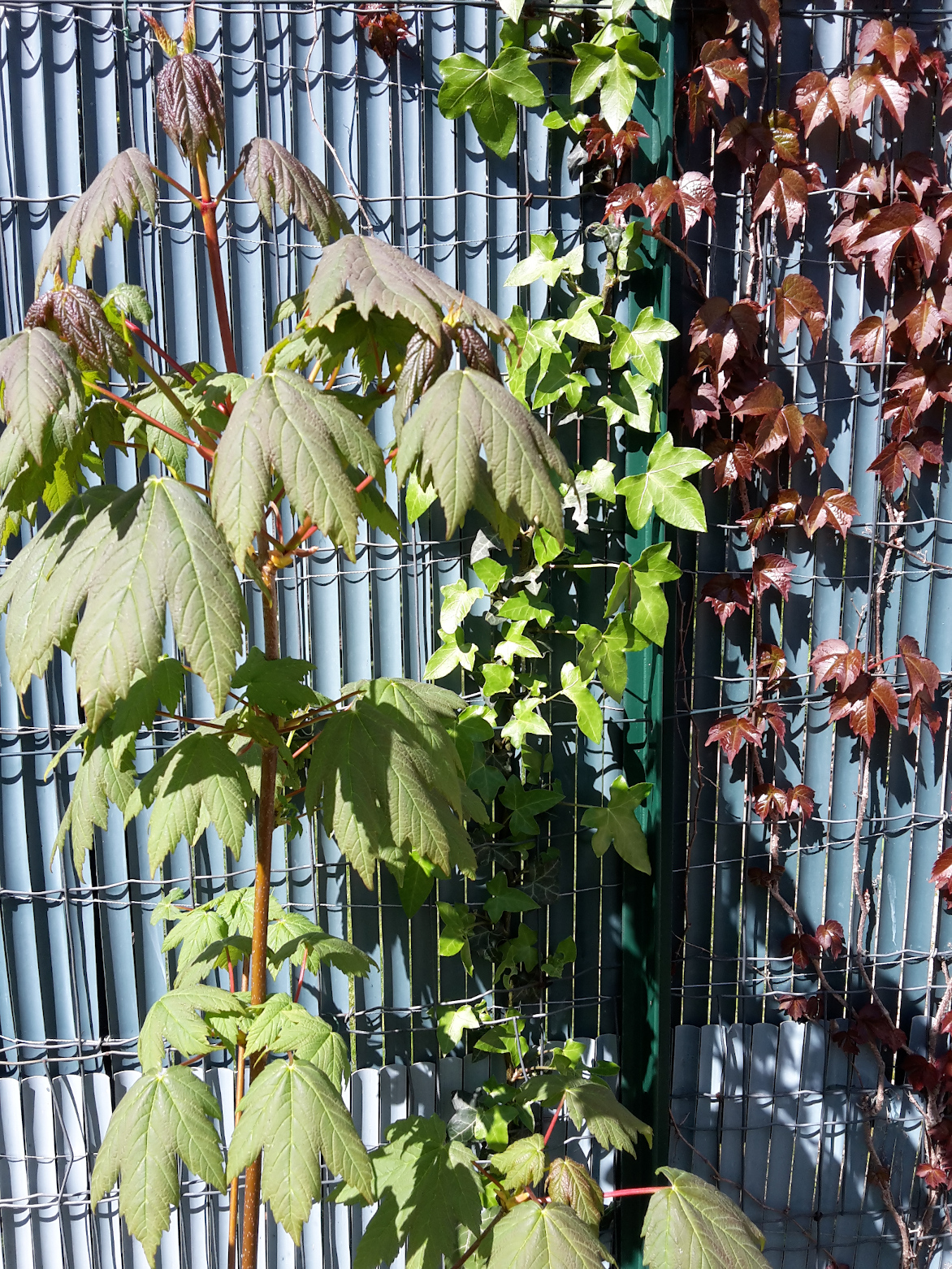 Voici une photo avec (de gauche à droite) un jeune Érable, du lierre et de la vigne vierge de mon jardin (Tarn).