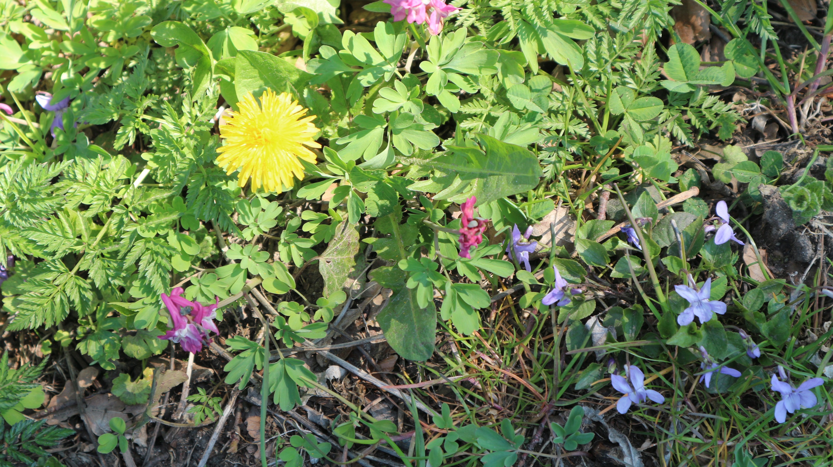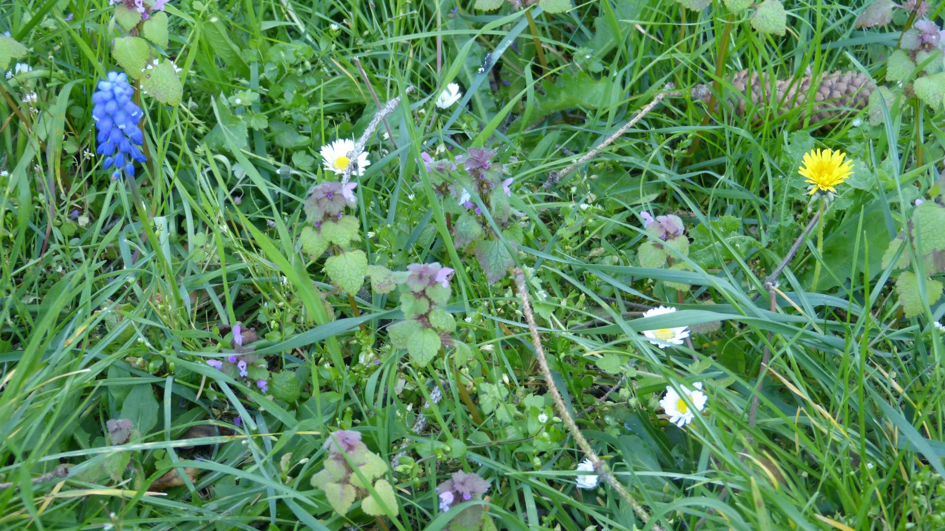 Voici une photo du parc de ma résidence, où les plantes apprécient ce printemps sans tontes à répétition. J'y vois au moins 8 espèces, dont des pâquerettes, des pissenlits, une violette, de l'herbe ... et d'autres espèces inconnues.