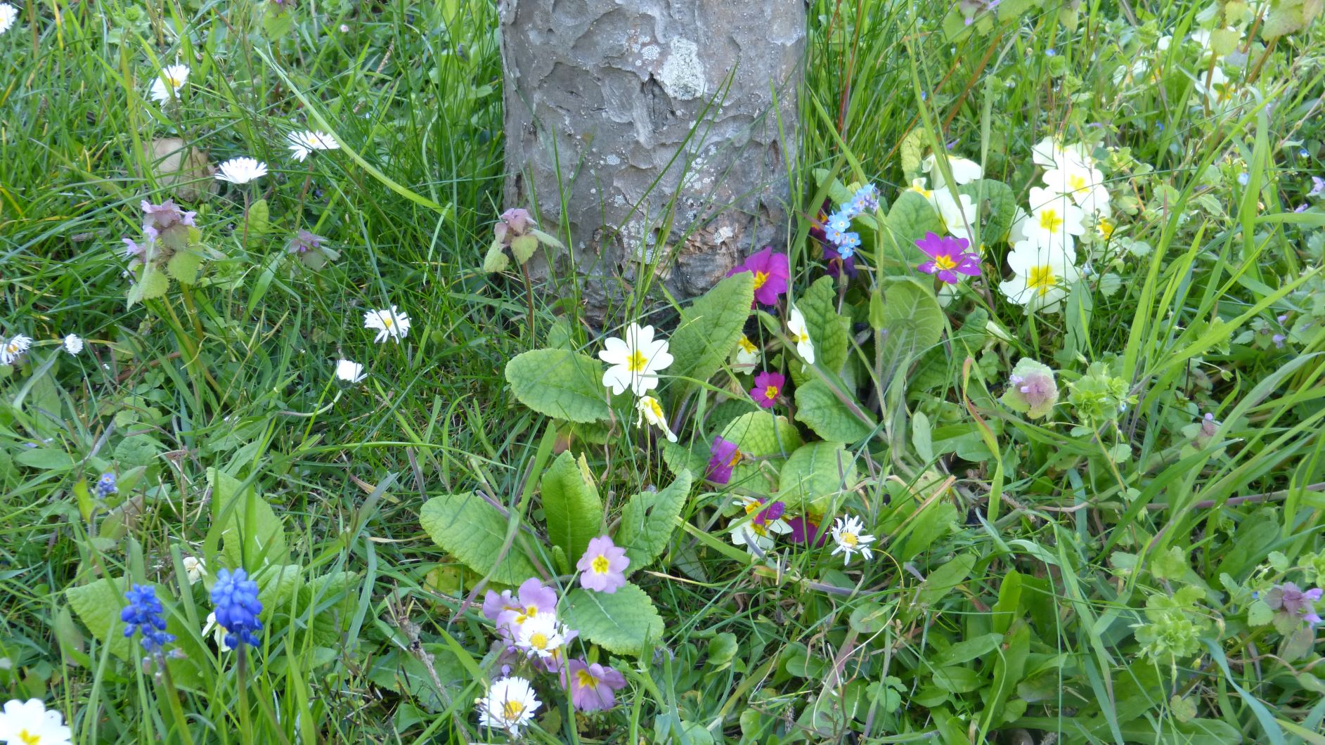 Il y a de l'herbe, des tulipes rouges et jaunes, des myosotis, des primevères, au premier plan à gauche, ce sont les feuilles d'un jasmin d'hiver, et dans le prolongement un prunier, vers le fond un laurier sauce et une mercuriale annuelle que l'on aperçoit et tout au fond un cerisier en fleurs roses et blanches (je crois que les fleurs de ce cerisier sont bicolores compte tenu de la greffe mais je ne suis pas sur).