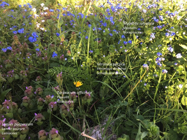 Plantes reconnues: lamier pourpre (Lamium purpureum), véronique de perse (Veronica persica), pissenlit, Gaillet grateron (Galium aparine), Alliaire ?