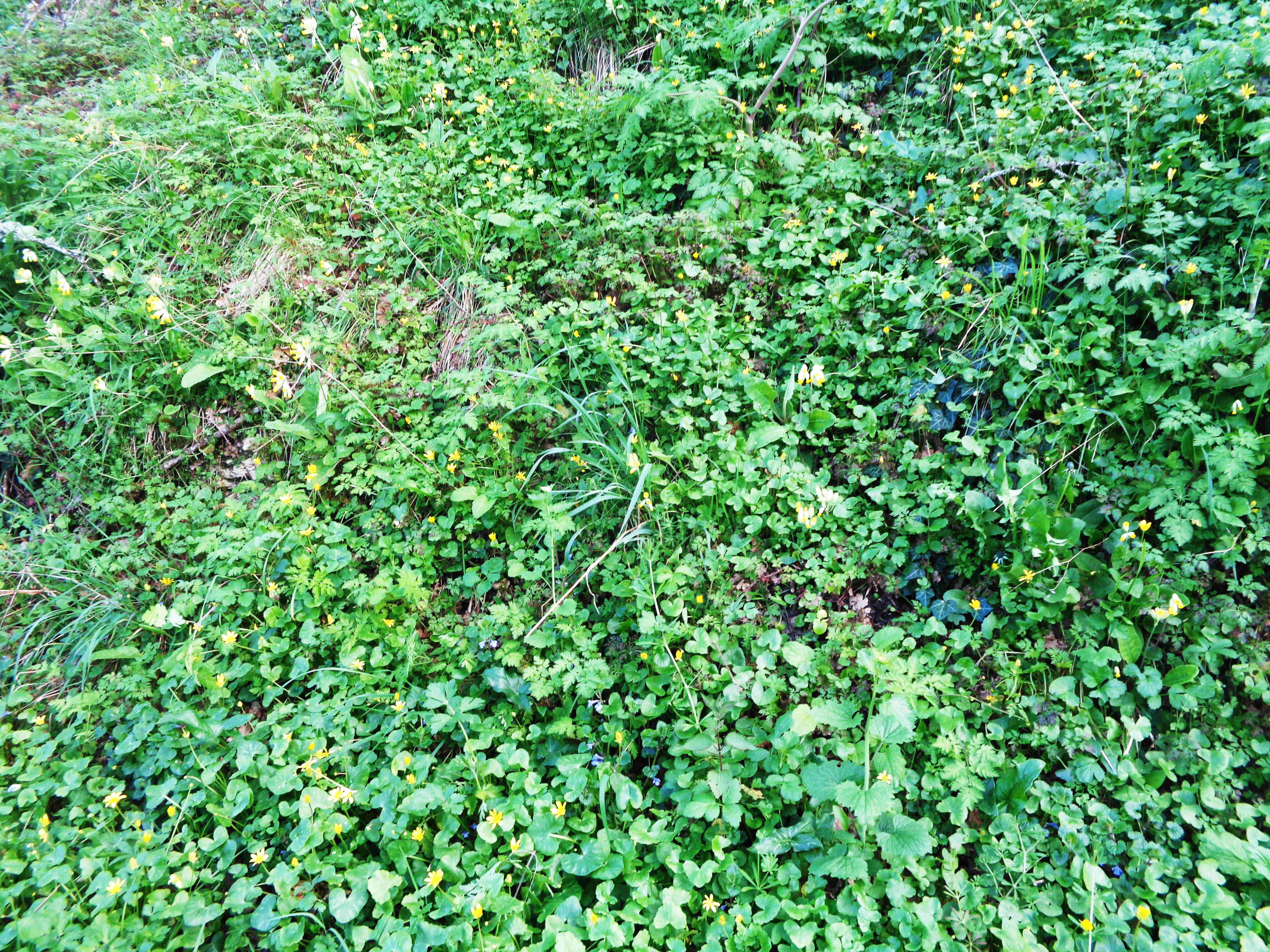 Rioux-Martin en sud Charente, région Aquitaine, je promène mon chien tout près de chez moi et j'observe... les plantes dont je connais le nom, au moins vernaculaire : Coucou primevère, ficaire, laitue, lierre, arum gouet, gaillet, lierre terrestre, benoîte commune, pissenlit, bouton d'or, ortie, lampsane, alliaire. Je vois aussi cette grande ombellifère (apiacée) qui envahit mon jardin, dont j'ai déjà observé les feuilles, la tige, les fleurs, les fruits, les racines et que je n'arrive pas à identifier. Il y a aussi de grands herbes (poacées ?) que je suis incapable de nommer. Le tout sous de nombreux arbres mais qui ne sont pas sur la photo, saules, peupliers, noisetiers, pruniers sauvages et autres, heureux d'avoir un ruisseau tout près. La photo n'est pas très belle ! réduite pour faire moins de 2Mo et en confinement ici je n'ai qu’un appareil de base et peu de compétences pour le régler au mieux.