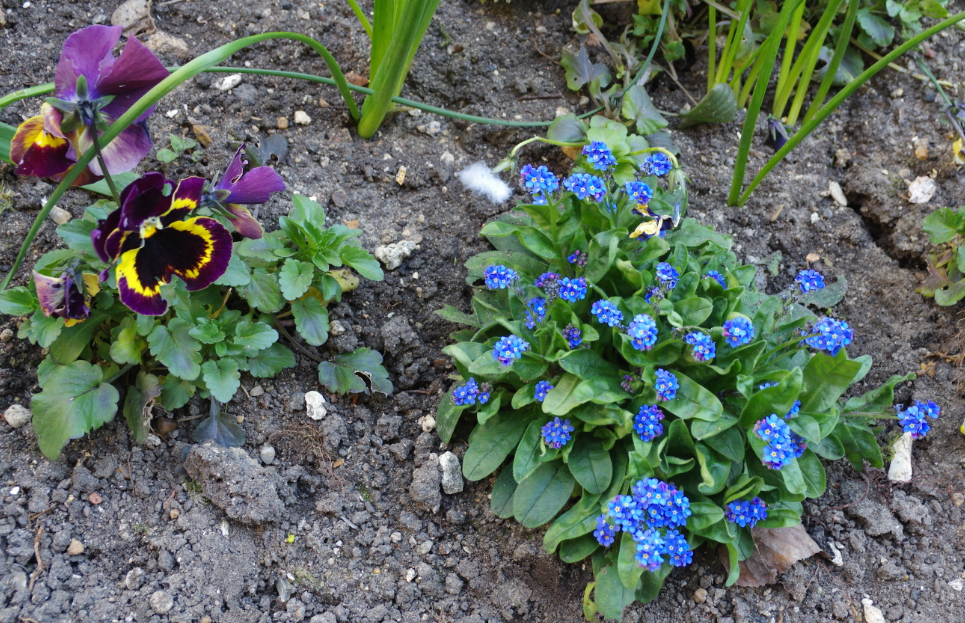 Espèces : à gauche, Pensée (Viola tricolor L.), à droite Myosotis des Alpes (Myosotis sylvatica Hoffm.)