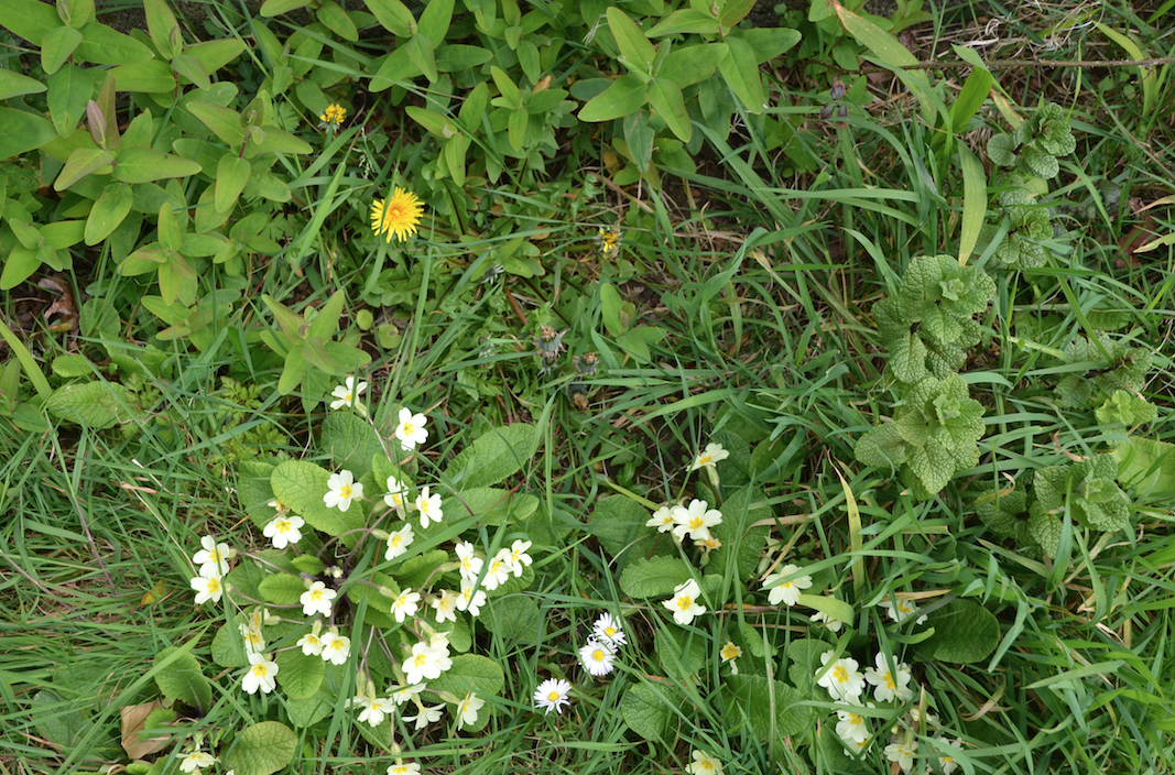 Un coin de jardin, avec pâquerettes, primevères, pissenlit, menthe, herbe, et d'autres dont je ne connais pas le nom ...