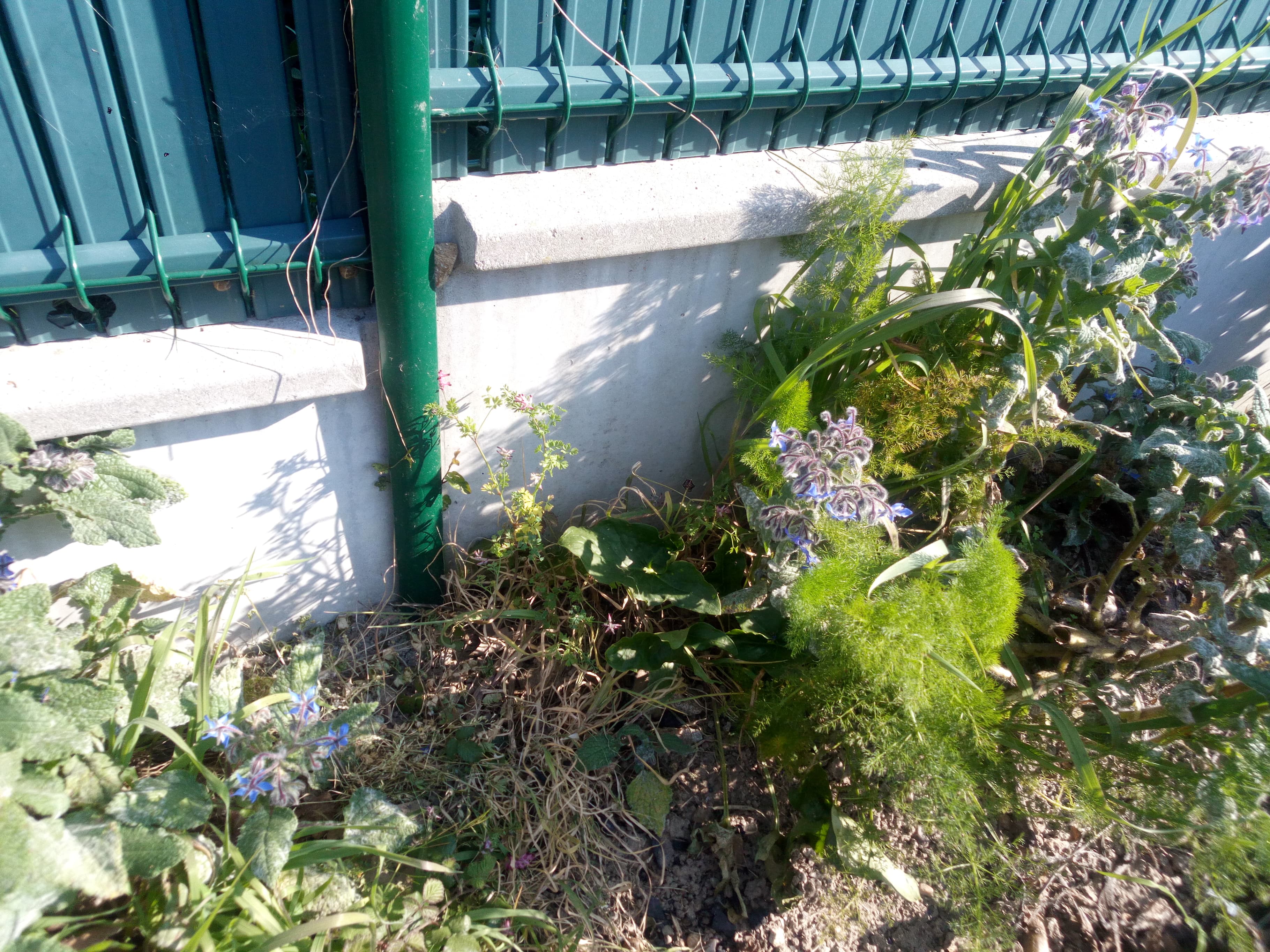 Ces plantes se trouvent dans un autre coin de mon jardin. Il y a de la bourrache, plein de bourraches avec d'innombrables abeilles et bourdons qui viennent s'y régaler! Il y a aussi du fenouil sauvage qui repousse tous les ans à cet endroit, de la fumeterre, des ronces, de l'Arum italicum
