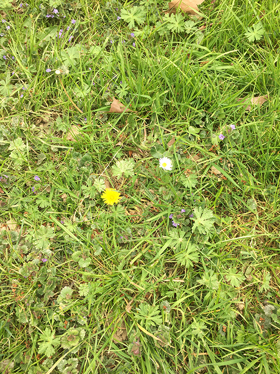 pâquerette, pissenlit, lierre terrestre et géranium à feuille molle (et du gazon)