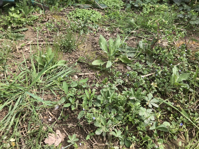 Dans un coin de notre jardin à Landiras (33). On peut y voir au premier plan un jeune pousse de pimprenelle, de la bourrache, un peu de pâquerettes à gauche, et une haie (dont je ne connais pas le nom de l'arbuste) au fond. Bonne journée !