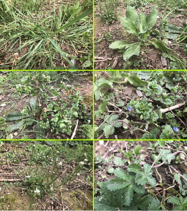 Il y a 12 espèces dont: Gaillet gratteron, Stellaire.sp, Pâturin annuel, Cardamine hérissé, Euphorbe omblette, Fraisier, Céraiste à leurs aglomérées, 2 mousses et 3 inconnues.