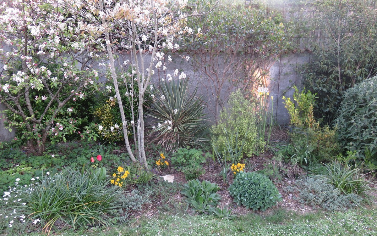 on distingue au fond un oranger du Mexique en début de floraison (planté par mes soins), puis au premier plan des graminées Stipa ou cheveux d'ange, qui se sont ressemées abondamment, un Abelia à gauche, au tout premier plan des tulipes et une pivoine herbacée en train de sortir de terre; entre les Stipa du premier plan on aperçoit le feuillage argenté de lychnis coronaris (je le sais car je les ai plantés moi même ! on les voit peu)