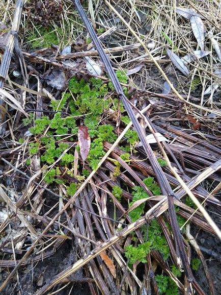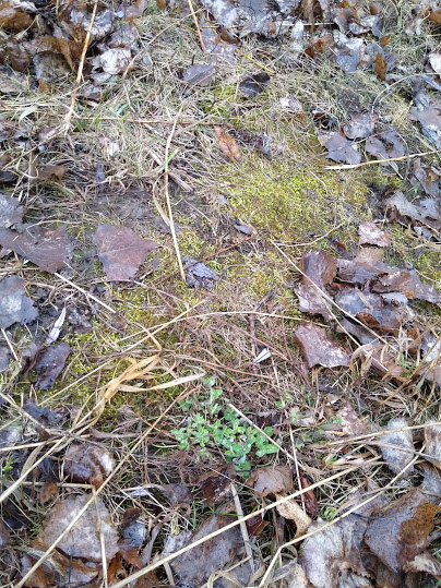 Au sol, j'y trouve de la mousse, de l'"herbe", une plante avec de minuscule fleur blanche (que je ne trouve pas dans mon guide), quelques parties végétatives de pissenlit et de véronique... Il y a aussi les feuilles lancéolés d'une plante à bulbe qui fait des grappes de clochettes bleues.