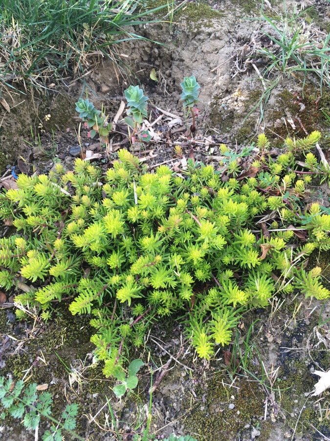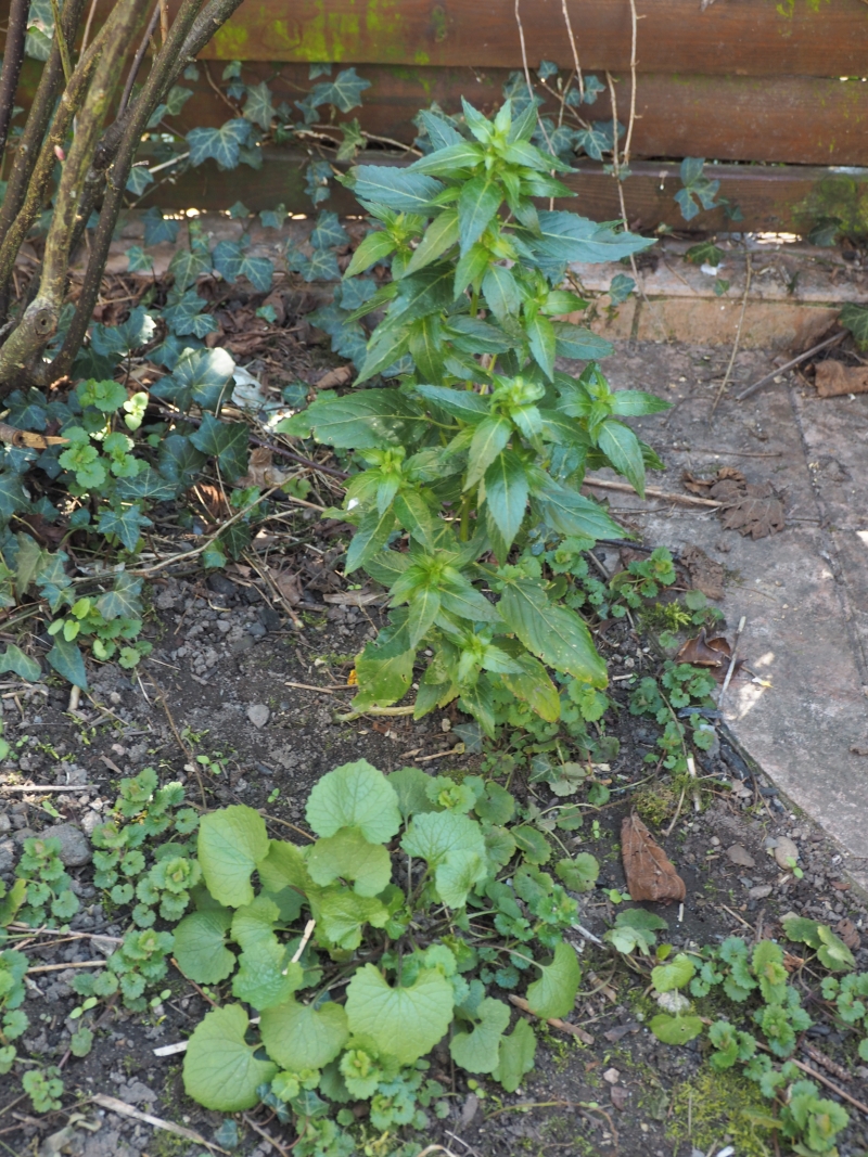 Voici quelques plantes toutes serrées dans mon jardin. Lamier, Chélidoine, pissenlit, ruine de Rome, orties...