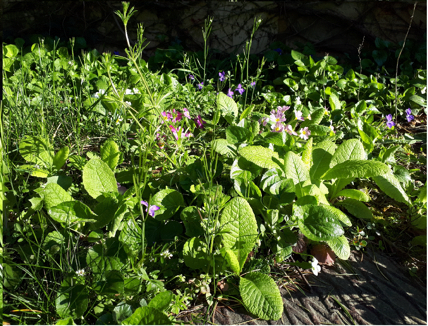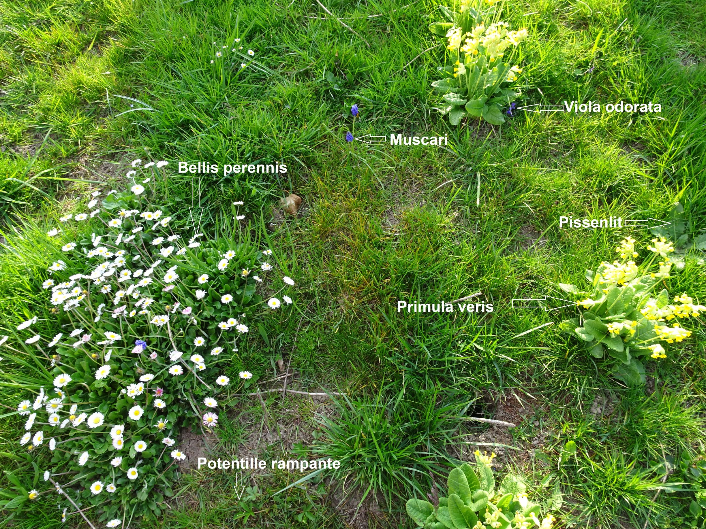 On peut voir des violettes, des ficaires, les autres plantes je ne connais pas leur nom.