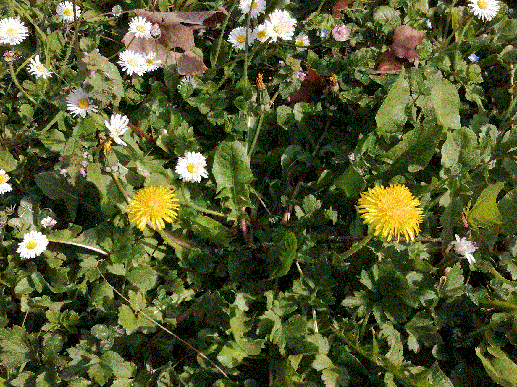 Présente : la pâquerette (Bellis perenis), une véronique, du géranium (Geranium robertianum), du trèfle et le pissenlit (Taraxacum officinale).