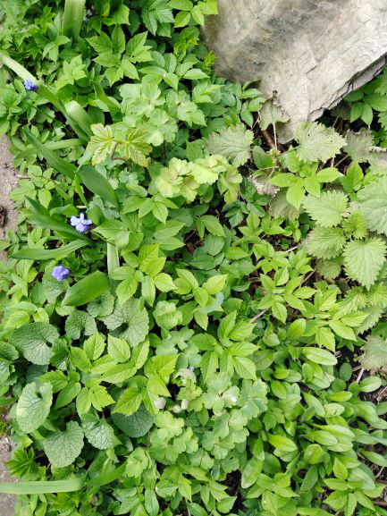 une parcelle de bidiversité dans mon jardin, on y retrouve, des orties (Urtica dioica), de l'égopode podagraire (Aegopodium podagraria), des feuilles de myosotis, du muscari, de l'alliaire officinal(Alliara petiolata), une ancolie (Aquilegia), une pousse d'érable (Acer), et un morceau de tronc d'un saule mort