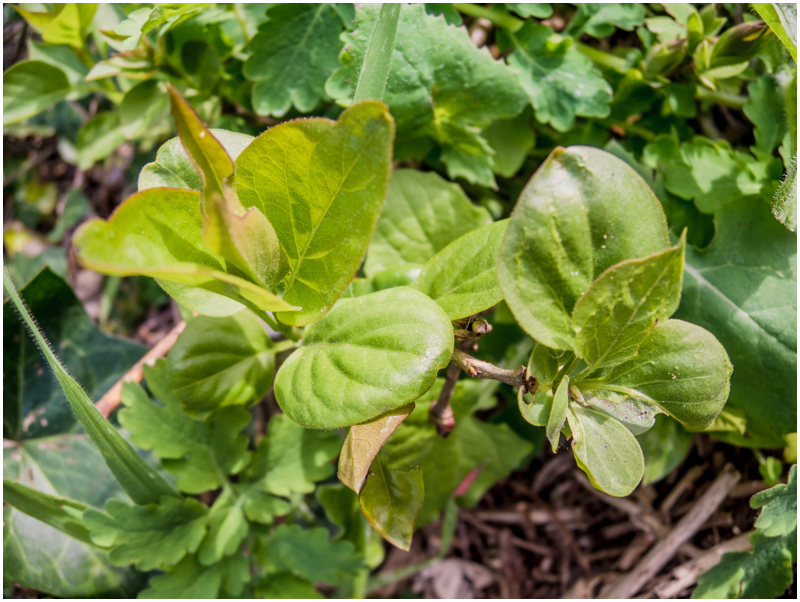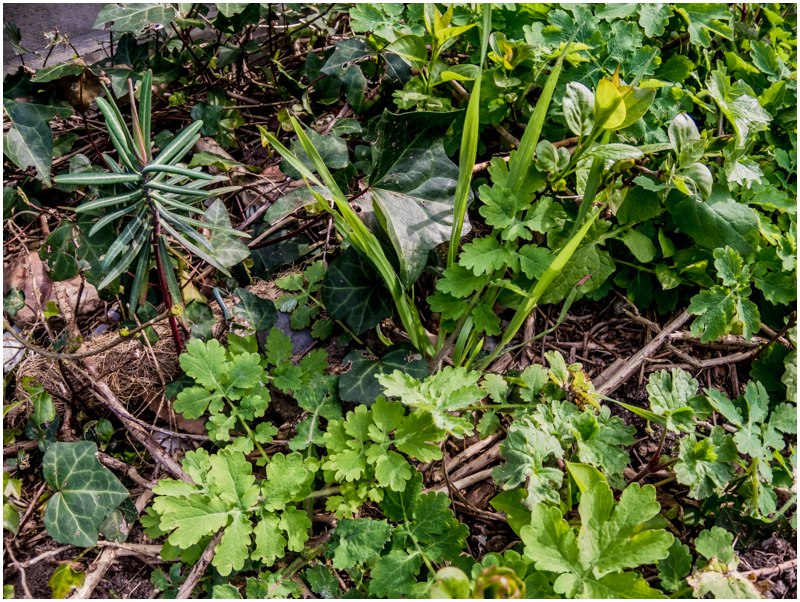 Bonsoir, voici une photo d'une biodiversité bien dense, prise dans mon jardin (Orléans, Loiret, région Centre), au pied d'un petit muret recouvert de lierre. On peut voir des feuilles de violettes, d'anémones fausses renoncules, de fabacées (vesces?), de geranium robertianum "herbe à Robert", et des pâquerettes au premier plan.