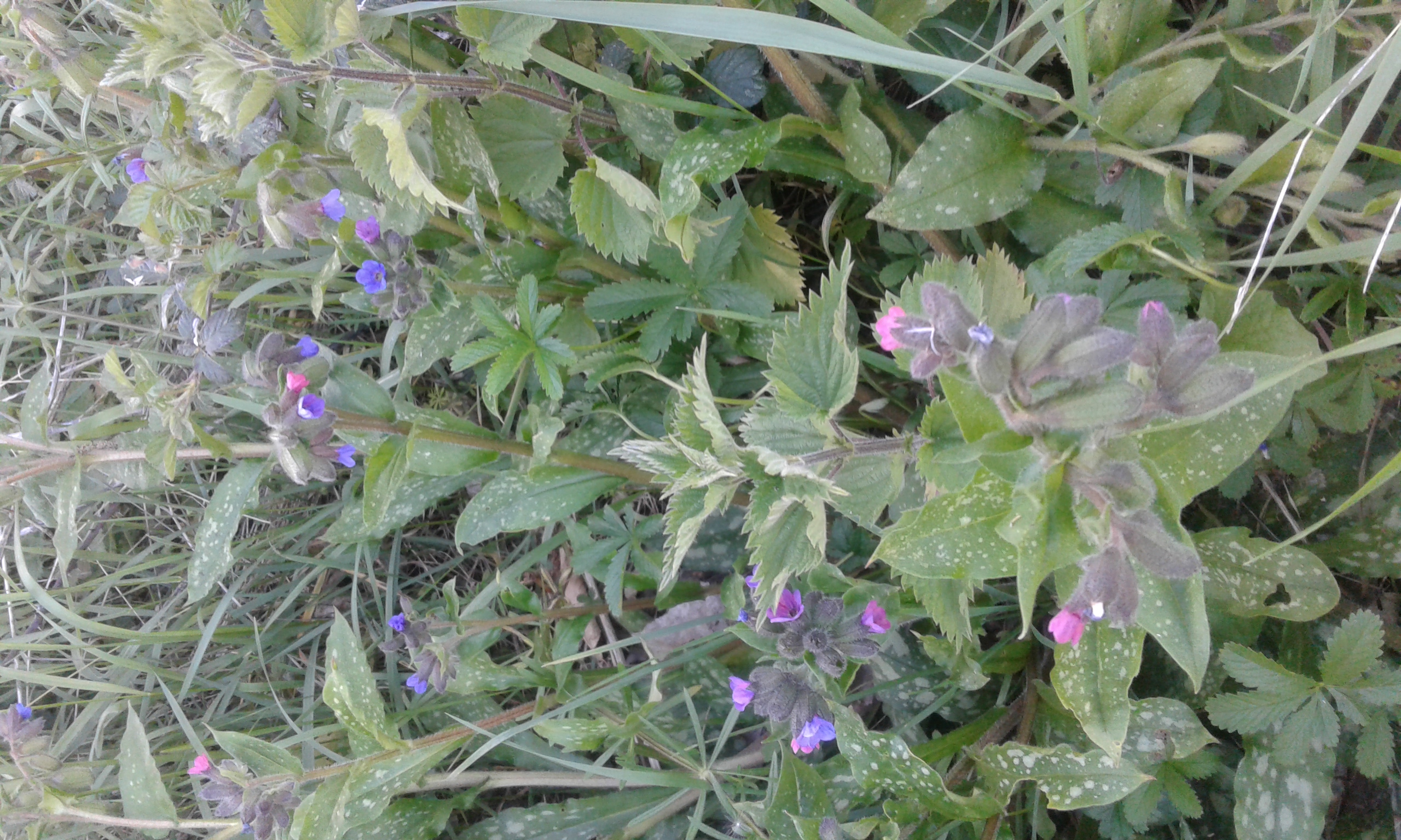 Sur cette photo je peux identifier l ortie, la pulmonaire, du chiendent et la feuille dentelee je ne sais pas.