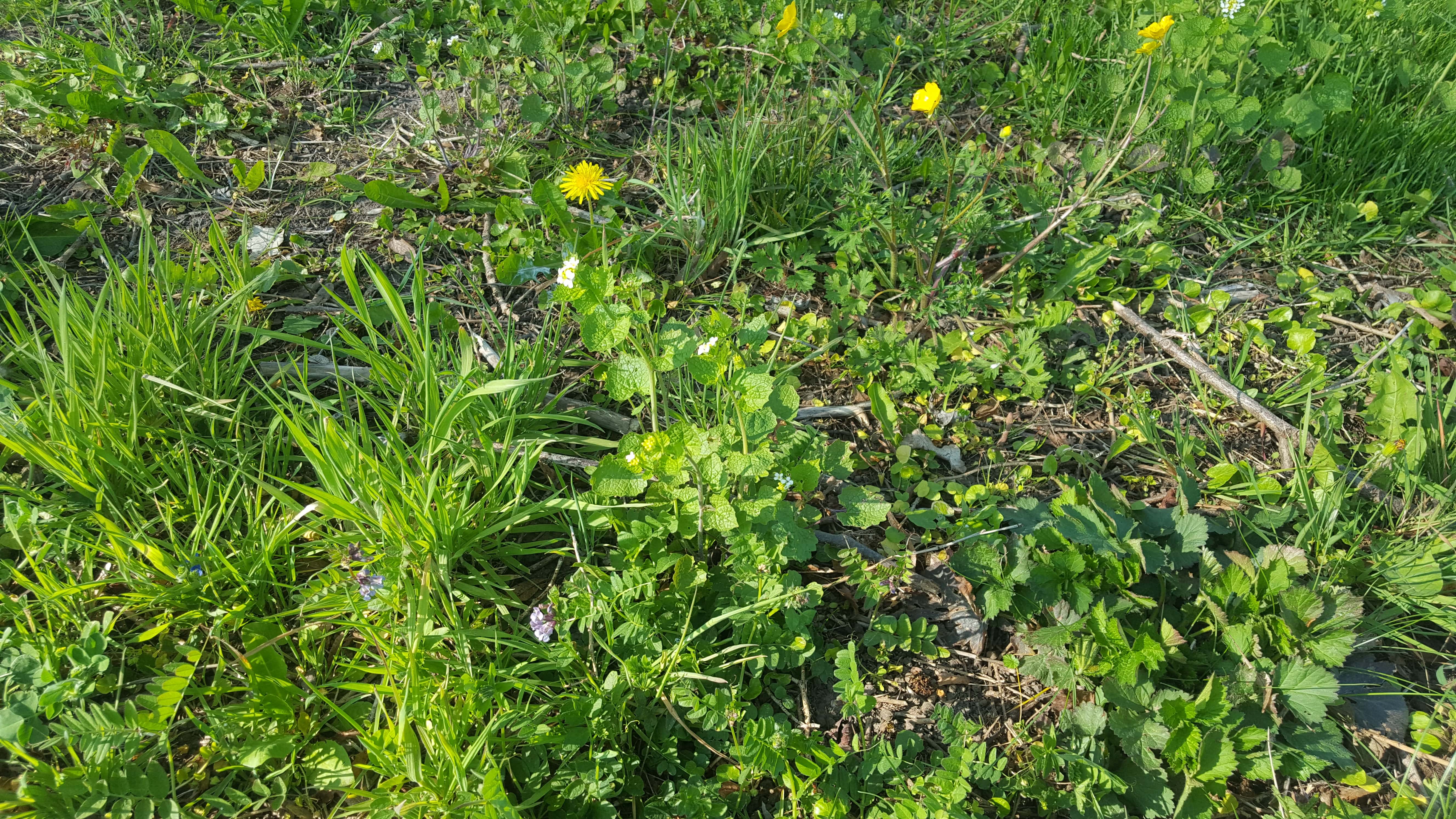 Dans ce petit bout, j'ai pu trouvé au moins 9 espèces: la Véronique de Perse, le Lamier Pourpre, Pissenlit, la Jacinthe des bois, l'Arabette de Thalius, graminée, céraiste commun (ou aggloméré, ou à pétales courts?), laiteron épineux, cerfeuil des bois (ou cigüe tachetée??)....
