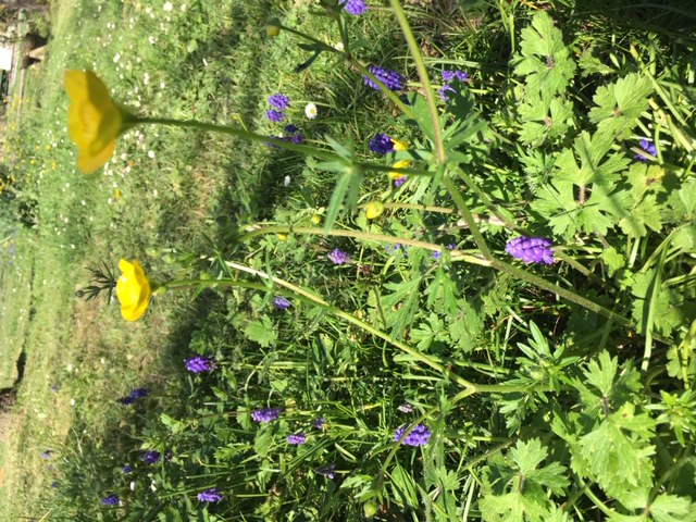 A notre droite: de l'herbe selon moi  du paturin, avec dépassant une fleur bleue appartenant à une adventice dont je ne connais pas le nom.