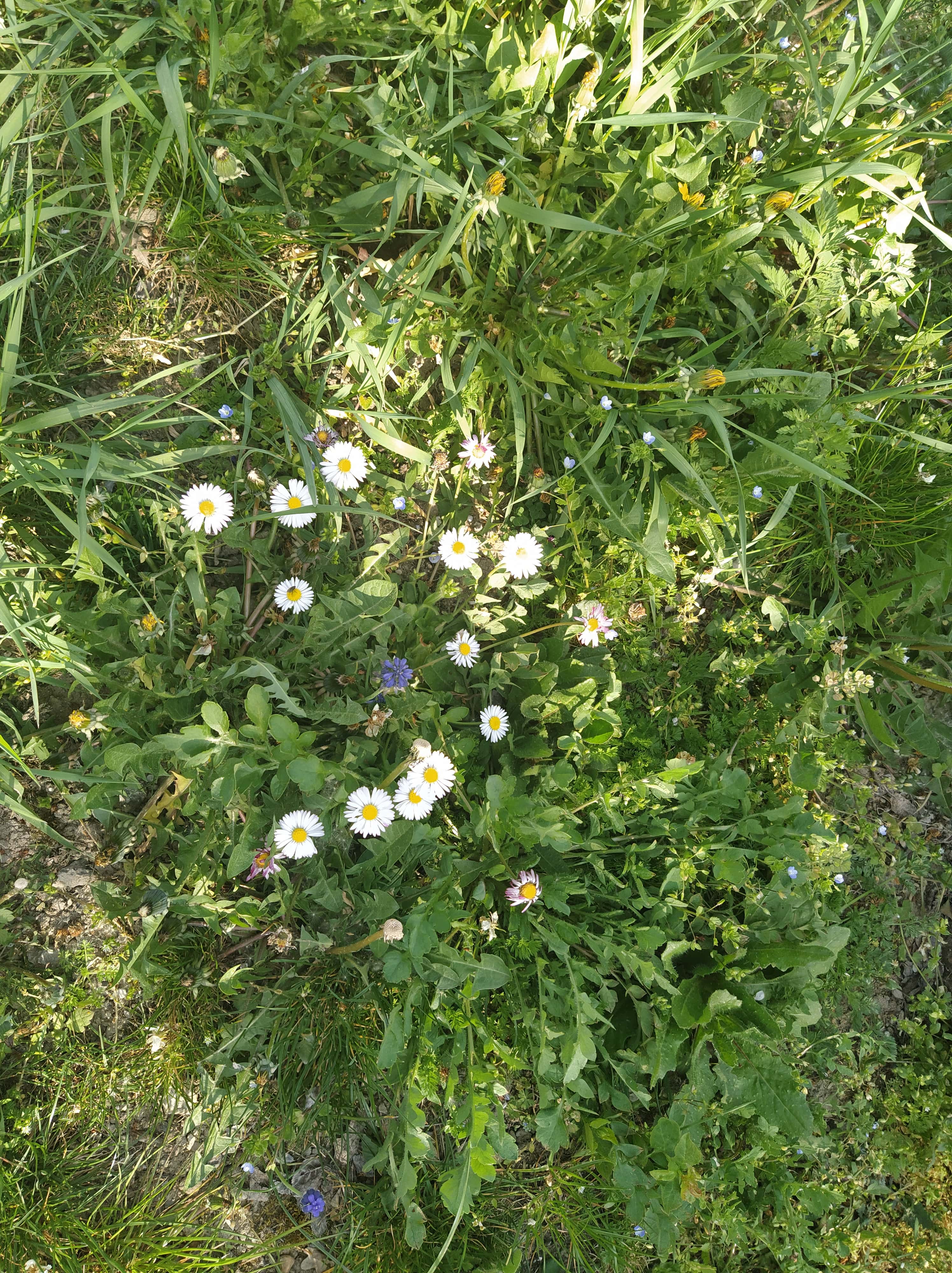 On aperçoit des pâquerettes (bellis perennis) roses et blanches, des feuilles de chardons, de la mousse, les tiges d'une fleur à bulbe (mais aucune fleur n'est encore sortie de cette belle touffe), du pâturin et du gazon.