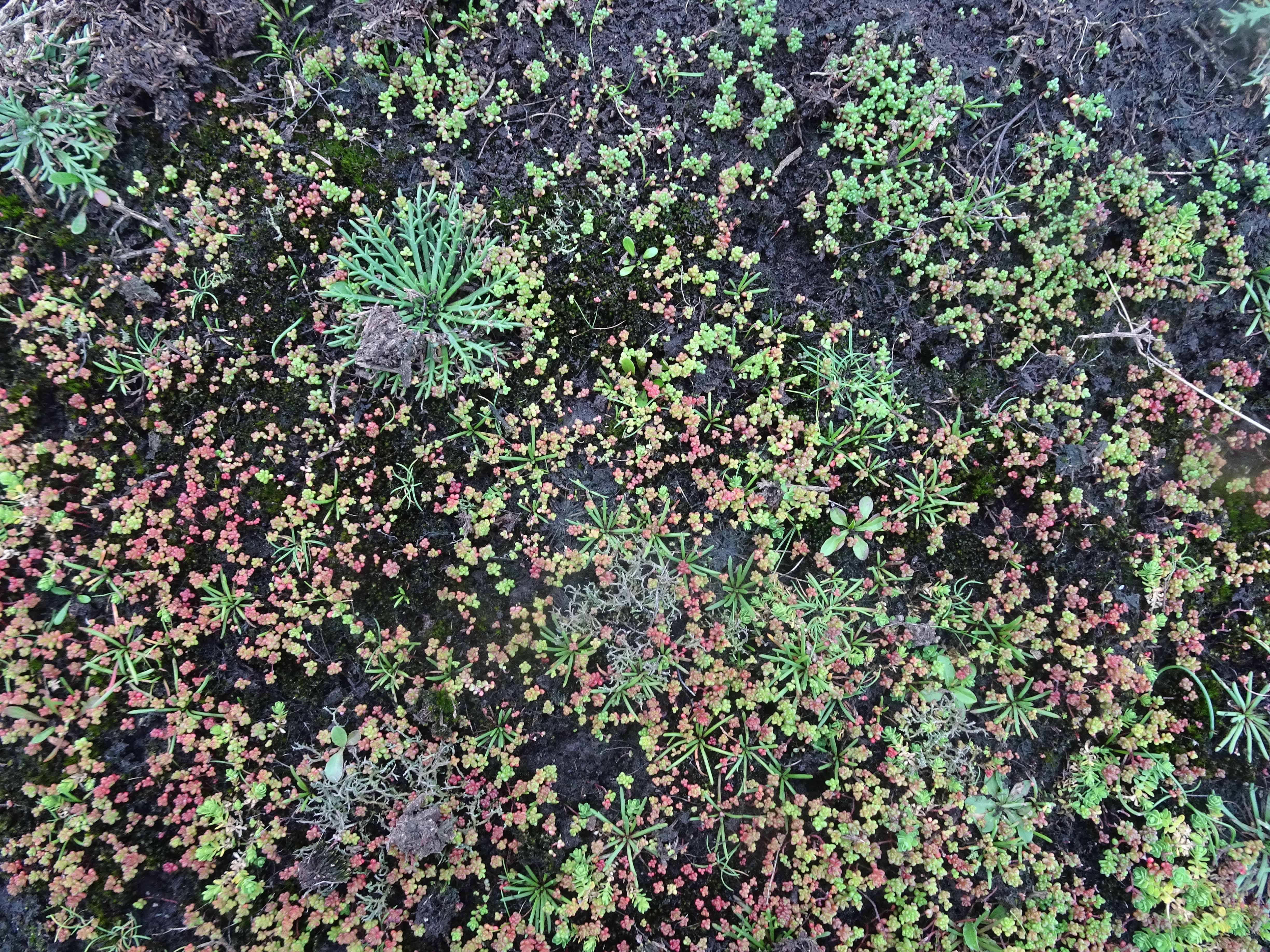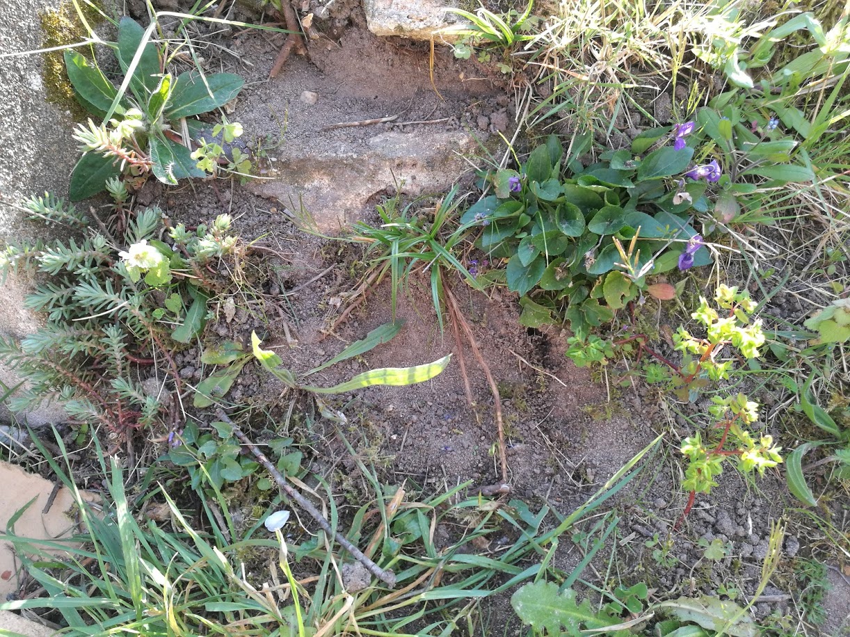 On peut apercevoir : à gauche Sedum forsterianum (Orpin Oracle), juste à côté (en sur-exposition) un lamier pourpre, des violettes (avec les fleurs fanées), en dessous de l'euphorbia peplus (Esule ronde) et de la Myosotis en haut à droite.