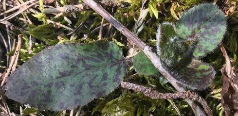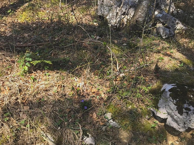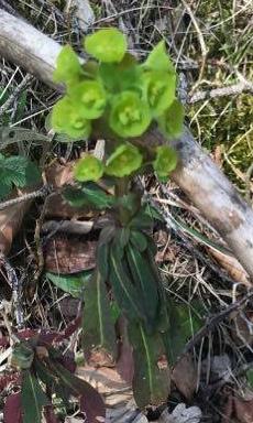 On peut y voir un hellébore fétide (aussi appelé pied-de-griffon), quelques primevères printanières, des mercuriales vivaces (au milieu à droite vers les bâtons, des crocus (blancs) à l’arrière-plan ainsi que des herbes et des mousses.