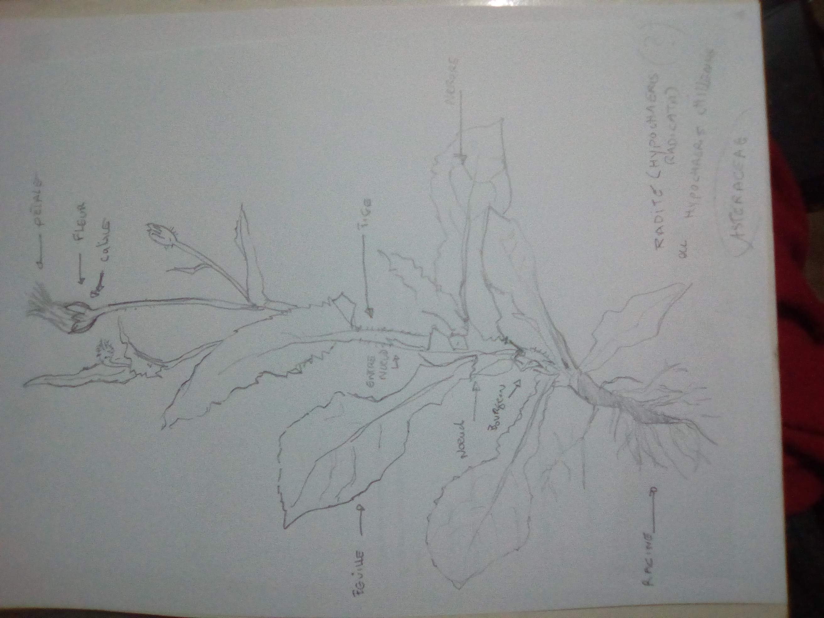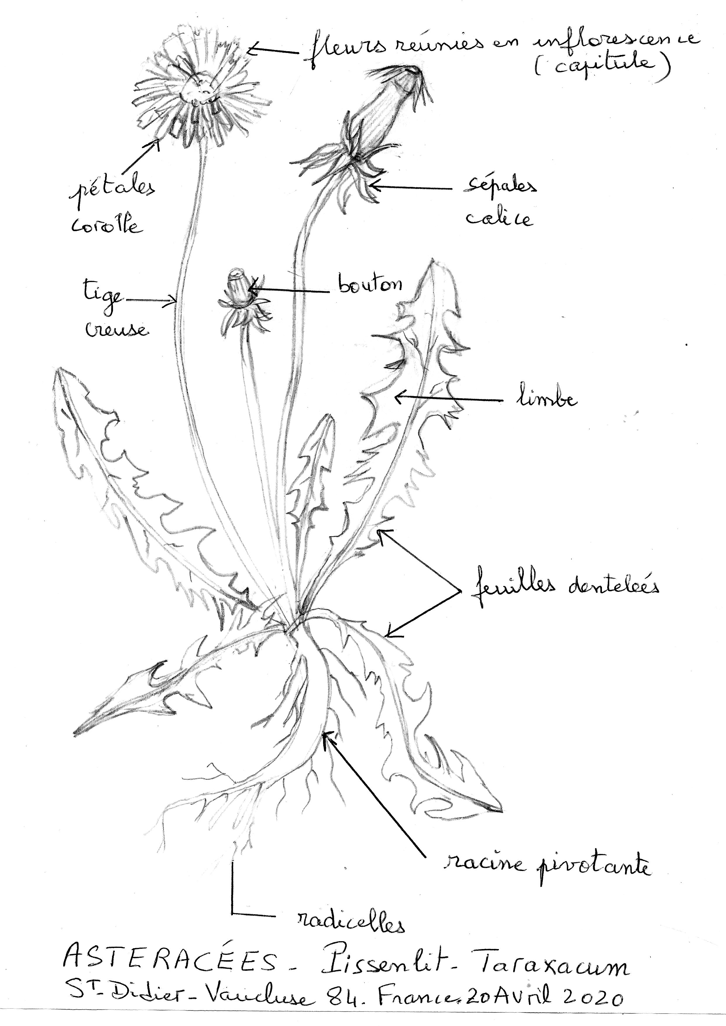 Voici un dessin schématisé d'un pissenlit que j'ai trouvé dans le jardin.