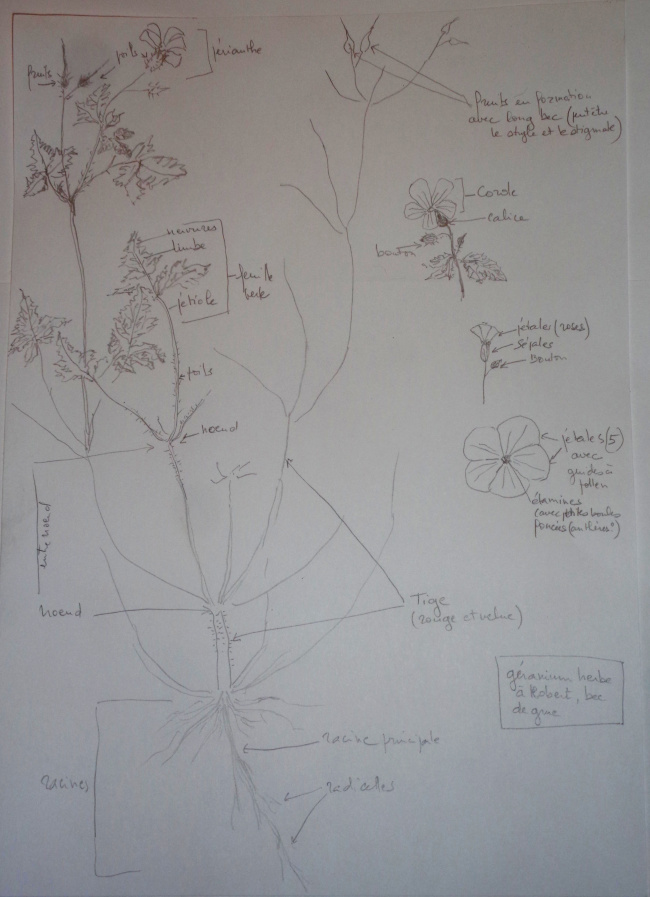 Sans loupe, sans gomme, avec un tout petit crayon à papier laissé par ma petite-fille, j'ai eu du mal à dessiner ces feuilles très découpées et la petite fleur dont j'ai deviné les étamines plus que je ne les ai vraiment distinguées. Pas pu les compter.