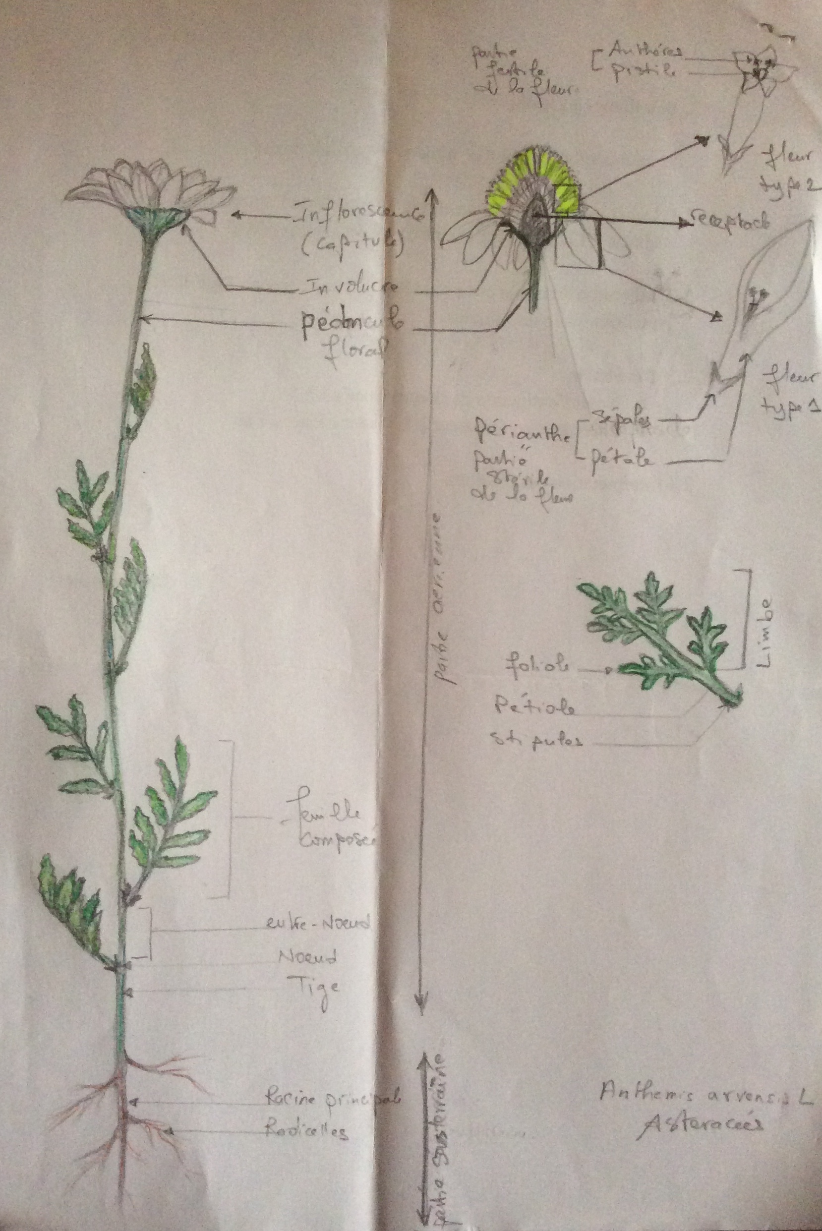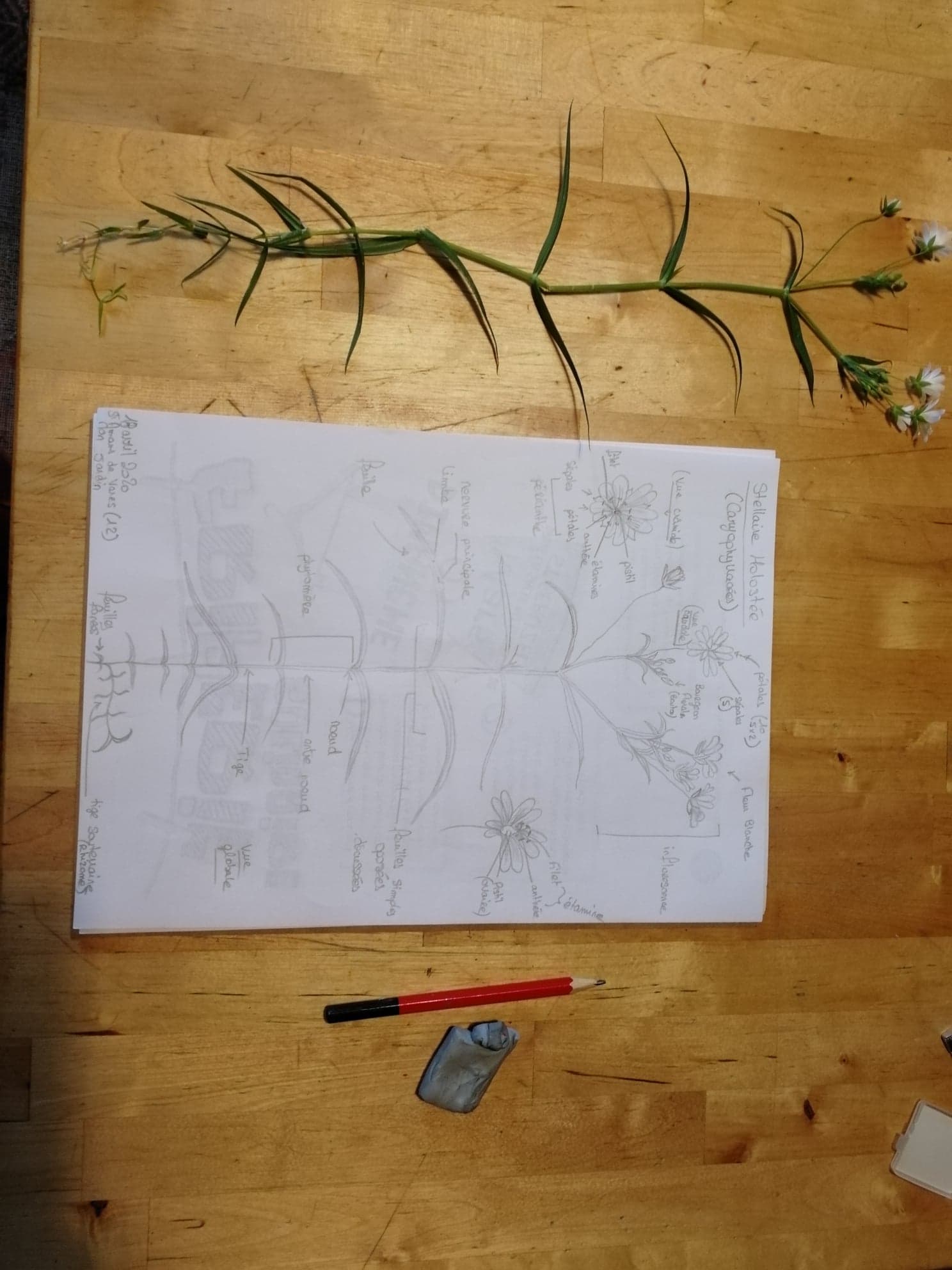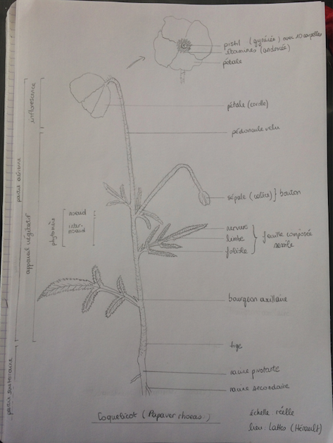 Très bon exercice ! Ça force à bien observer, dans les moindres détails, très intéressant. Pour les organes floraux, désolée j'ai fait ça très synthétiquement, les organes sont si petits... Heureusement j'avais ma loupe, mais je n'ai pas vu les étamines... D'ailleurs j'espère que mon dessin sera assez lisible. Je l'ai fait sur une feuille A3, donc en vrai on voit mieux je pense.