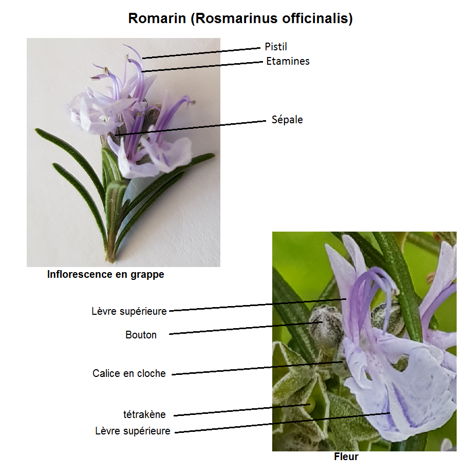 - Calice en cloche formé d'1 lèvre supérieure ovale et d'une lèvre inférieure à 2 lobes lancéolés (non visible sur les photos)