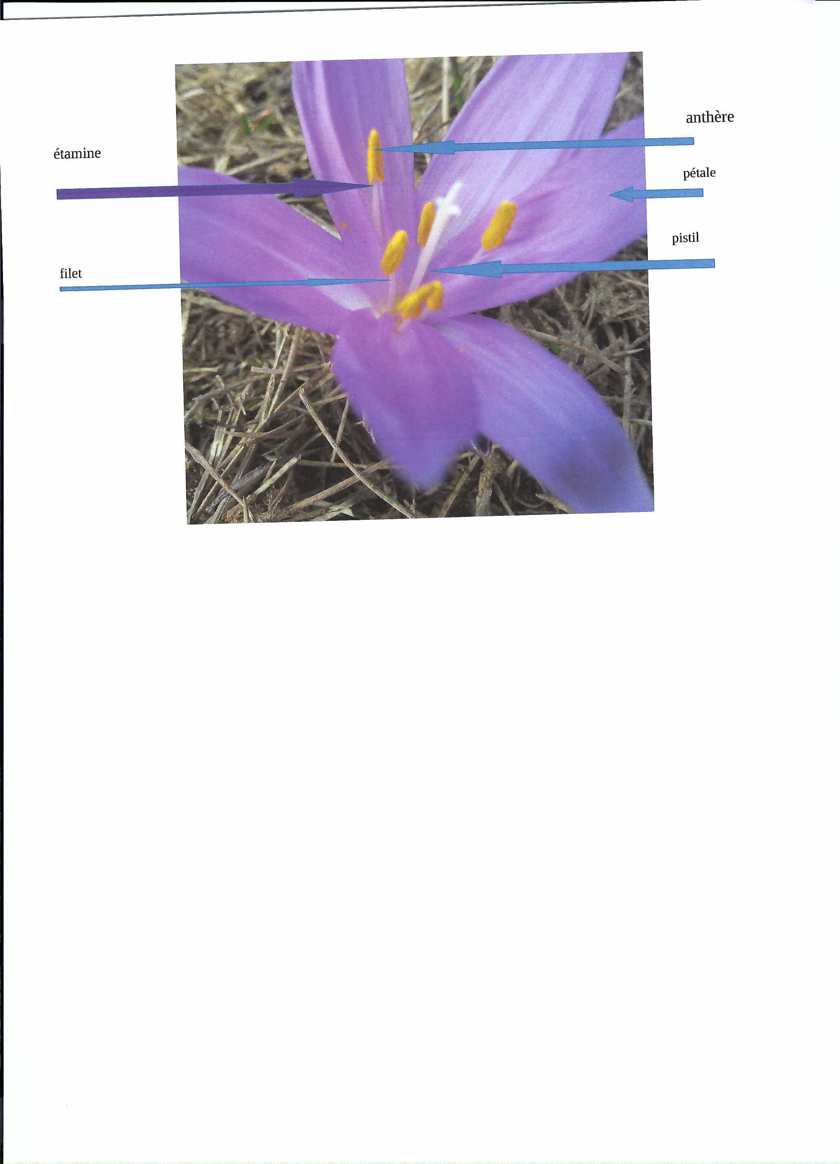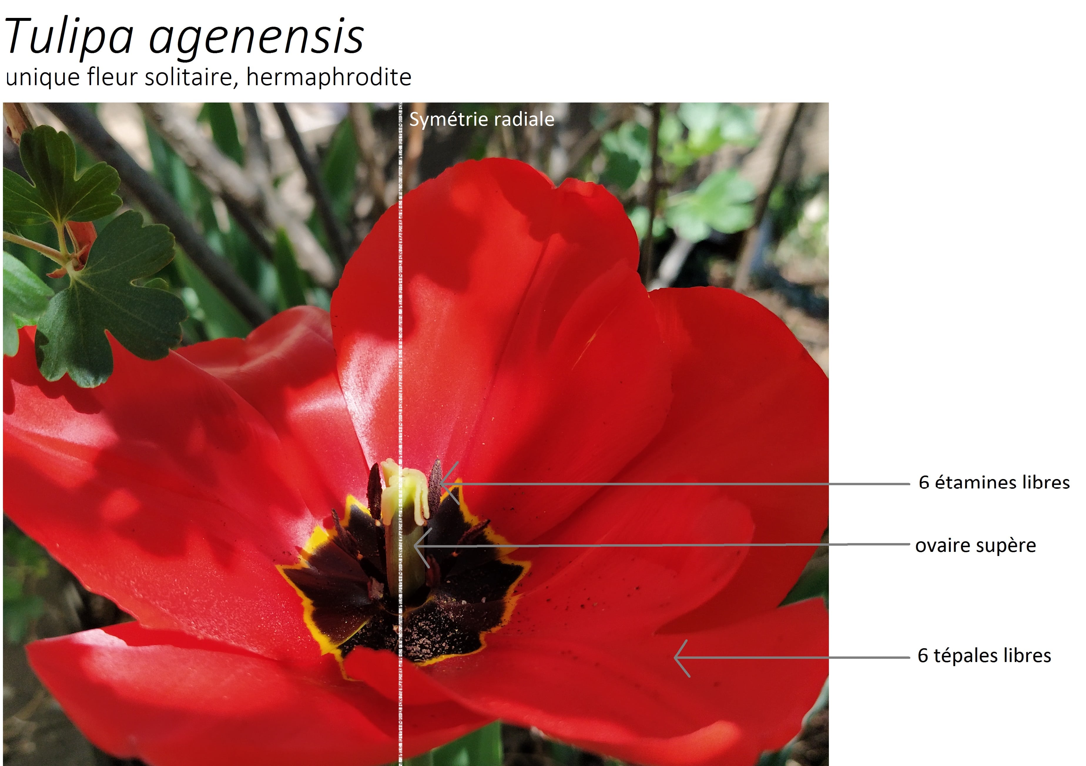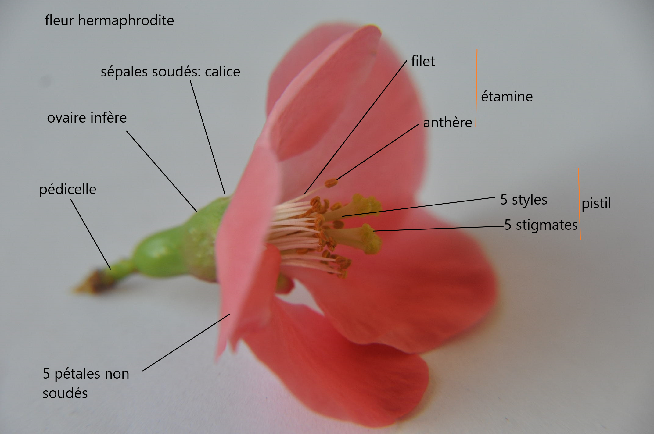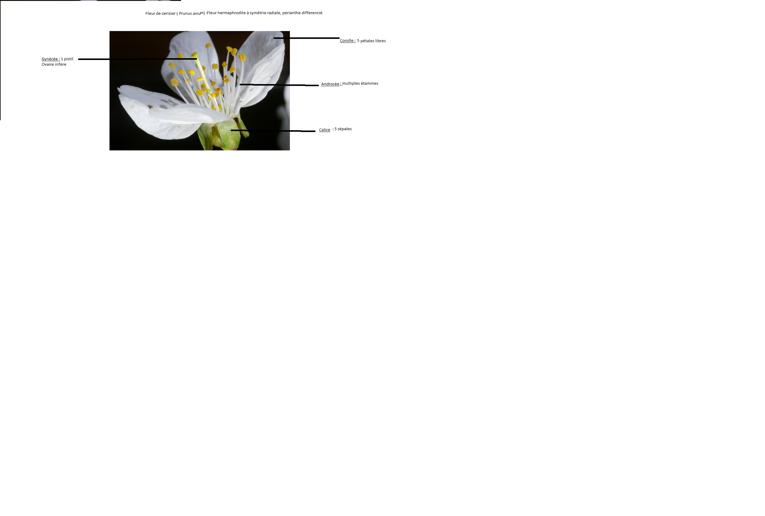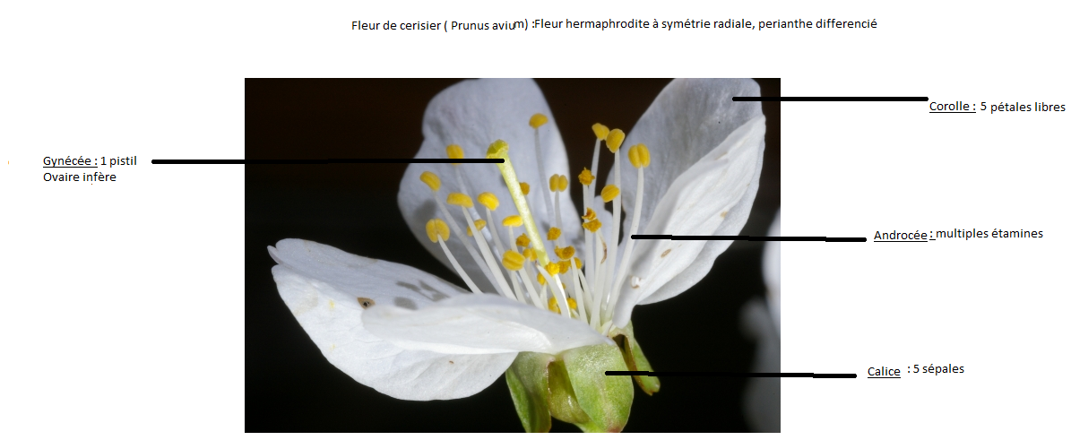 Voici une photo légendée d'une fleur hermaphrodite, à symétrie radiale, périanthe différencié. Elle a deux étamine et un pistil à deux carpelles. L'ovaire est supère.