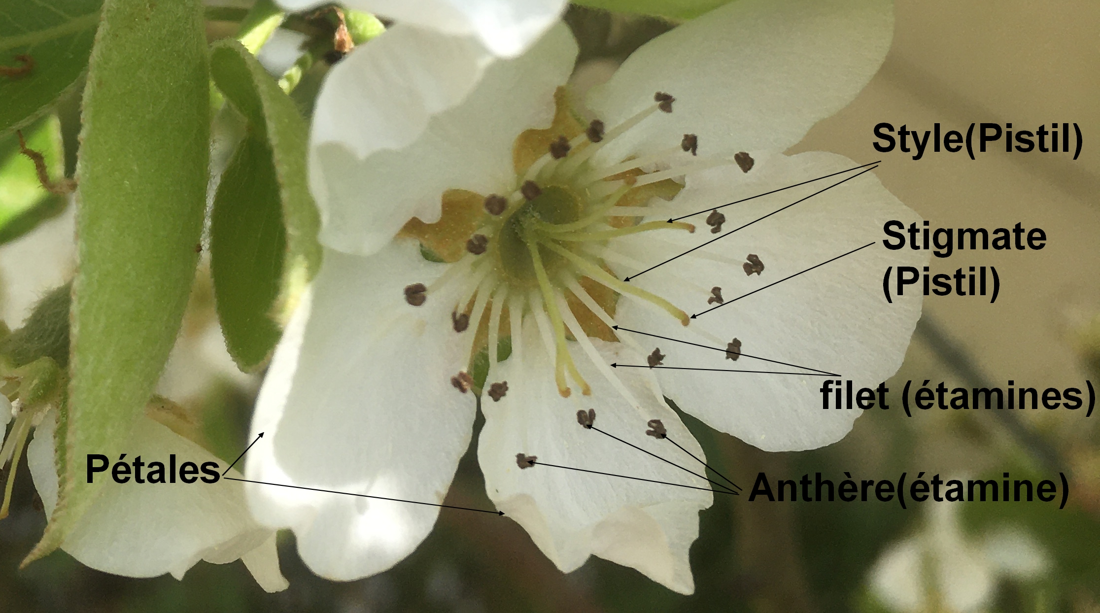 Voilà une fleur de mon poirier Williams Bon chretien. On peut remarquer une symetrie bilaterale des pétales.