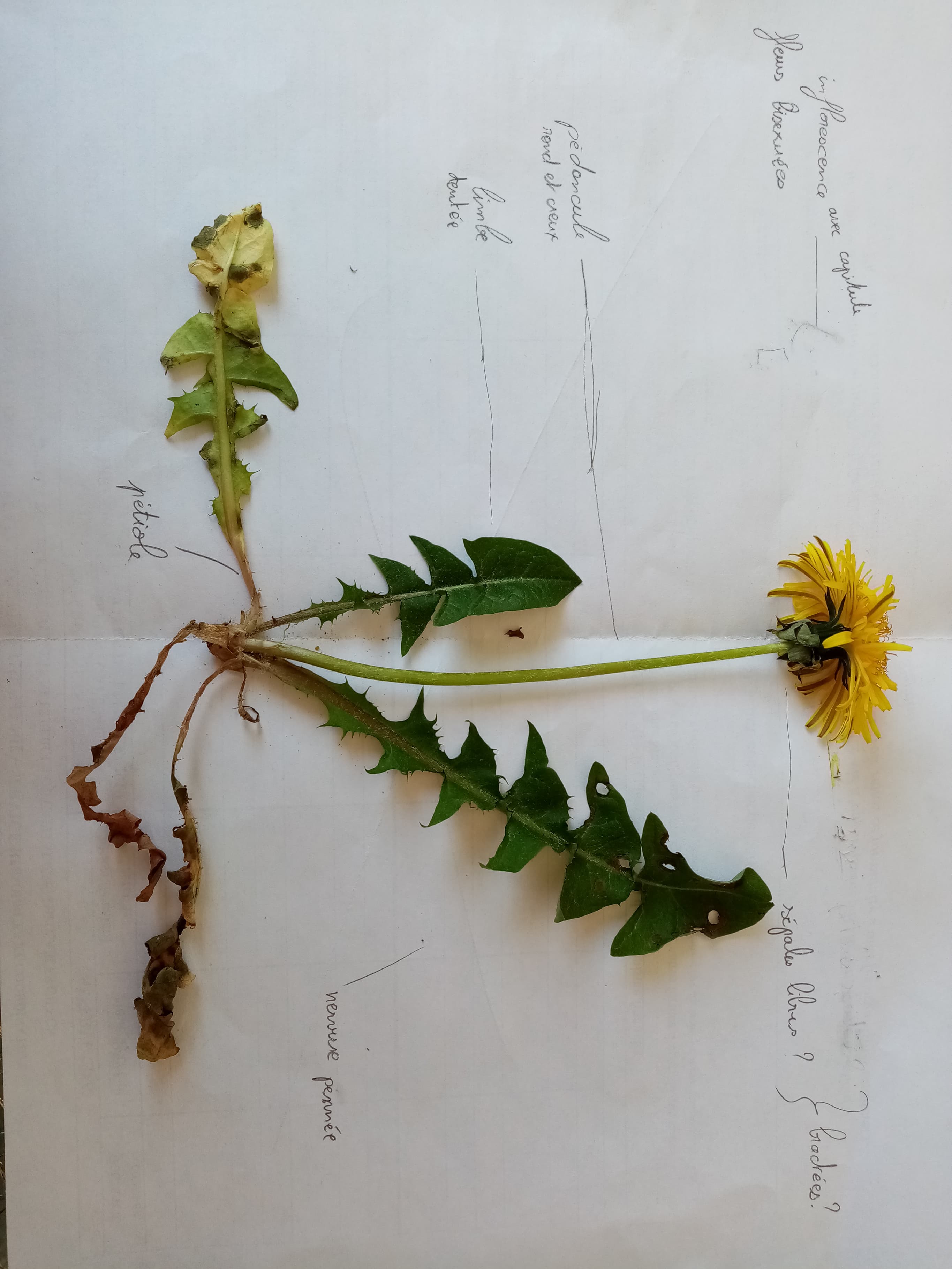 Voici mon essai à tenter de distinguer les différentes parties d'un pissenlit. J'ai eu du mal, notamment pour les sépales/bractées. Je ne sais pas si c'est une feuille simple ou composés.