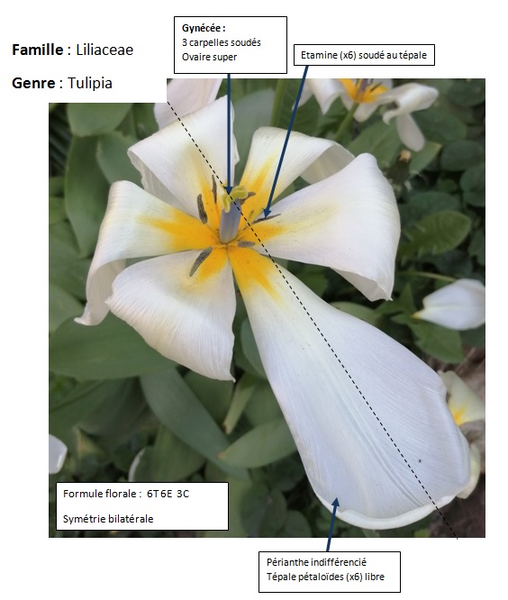 - périanthe est soudé (chaque pétale - 6 - et sépale soudés), réceptacle floral confondu avec le périanthe