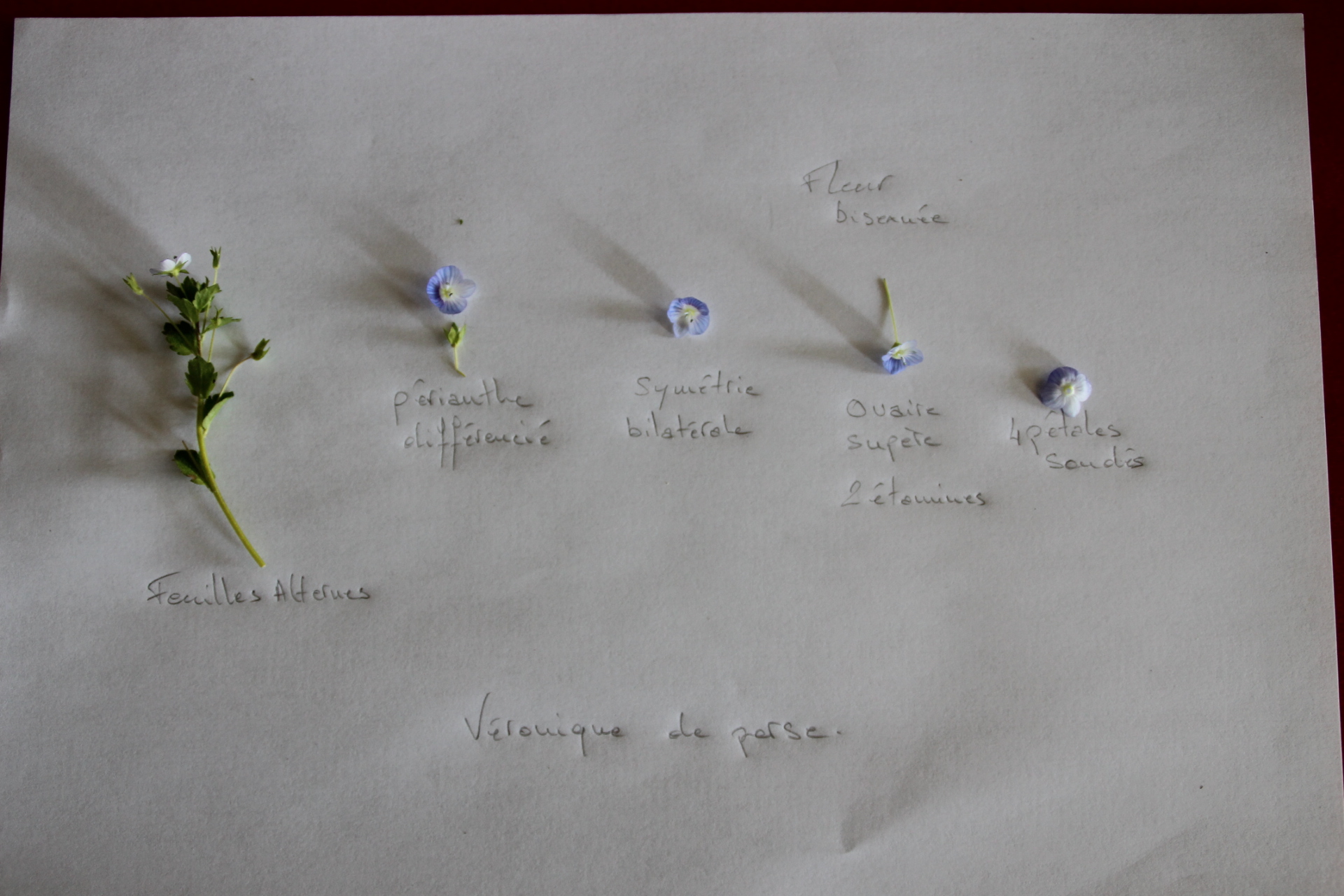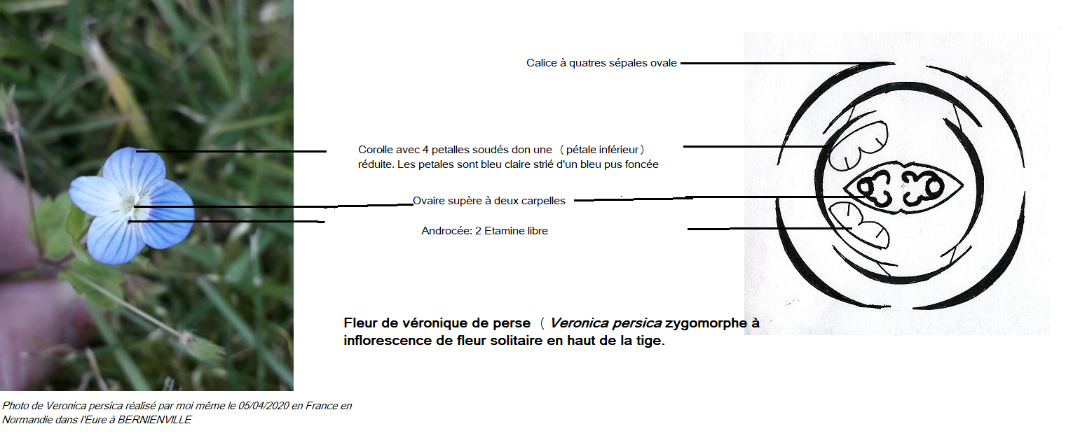 La véronique de perse fait partie de la famille des Plantaginacée sur l'image les feuilles son peu visible mais on peut les reconnaître facilement car elle sons en forme de cœur et fortement denté leur disposition dépendent de l'emplacement sur la tige : Les feuilles inférieur sont opposé et supérieur alterne et ne possèdent pas de pétiole ( sessile). (J'ai oublié de prendre plusieurs photo pour mieux voir les sépales et les feuille je sais c'est pas bien désolé ^^)