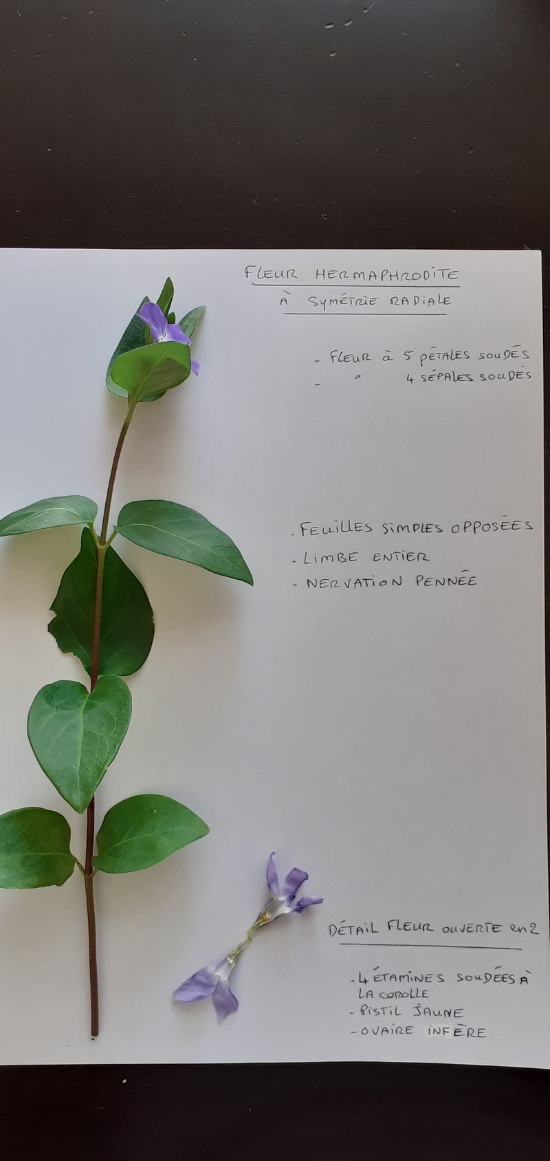 Pour répondre à la consigne, j'ai dû prendre plusieurs photos. Afin d'observer l'intérieur et de mettre en évidence les organes sexuelles de la fleurs, j'ai retiré le calice et découpé la corolle que j'ai ensuite pliée.