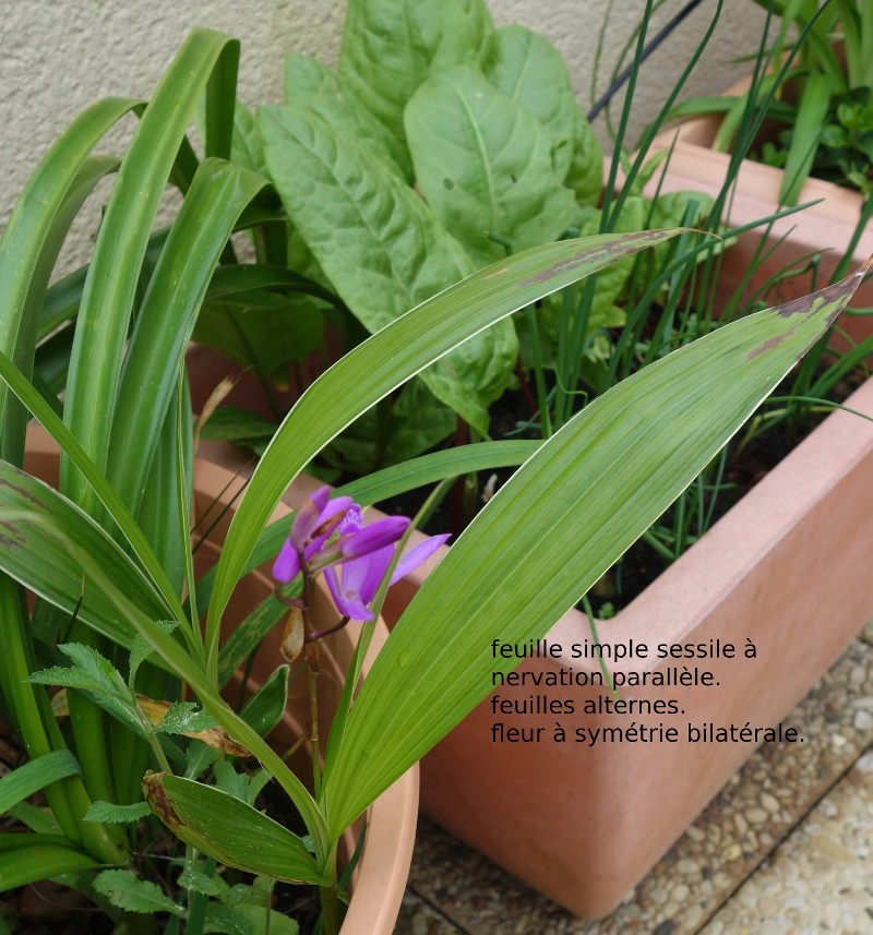 • symétrie bilatérale de la fleur, feuilles a nervation parallèle, soudure des étamines et du pistil en un organe particulier : le gynostème, ovaire infère, fleur trimère.