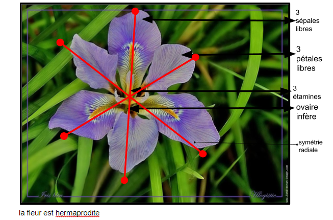il s'agit d'une fleur hermaphrodite avec un ovaire supère et une inflorescence déterminée (sur ce point j'ai un doute).elle a une symétrie bilatérale et une corolle de 5 pétales libres.