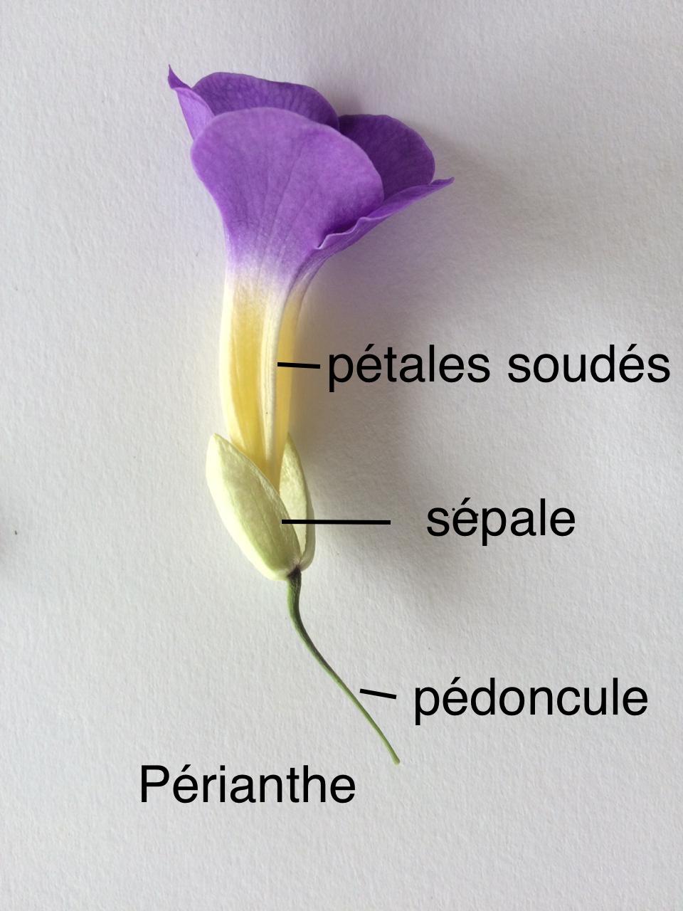 - fleur à symétrie bilatérale : le calice est constitué de 2 sépales;la corolle est composée de 5 pétales soudéesqui donne une fleur en cloche.( base jaune clair, extrémité violette)