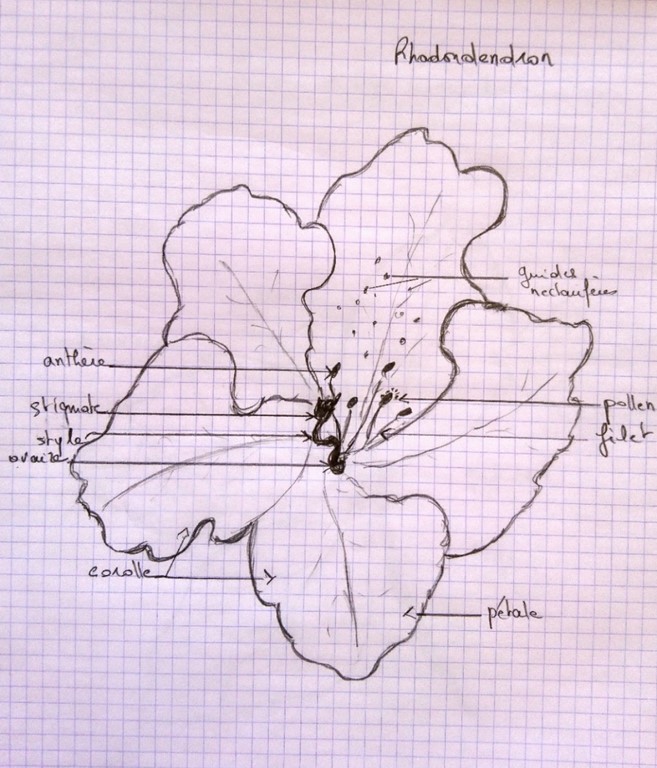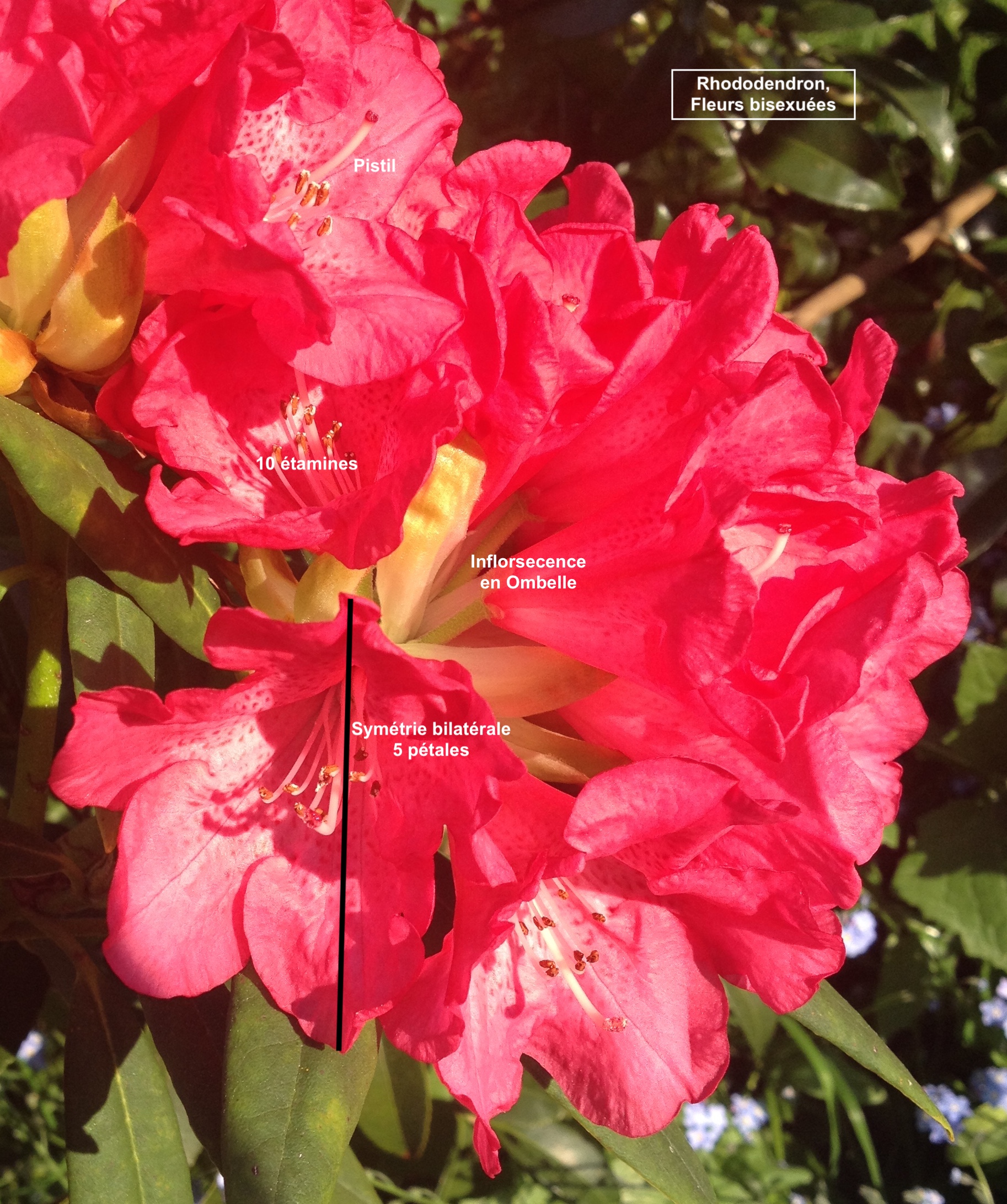 Le rhododendron. Ses fleurs sont bisexuées, de symétrie bilatérale. L'ovaire est supère. Les fleurs sont disposées en grappes ombelliformes terminales. Le feuillage est persistant, les limbes sont ont un bord entier, de forme ovale mesurant environ 8cm de long.
